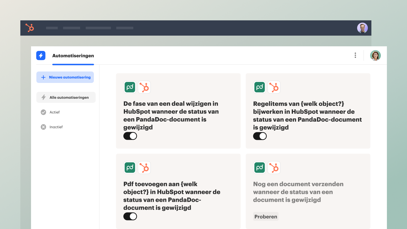 Het koppelen van de PandaDoc-integratie is snel en eenvoudig, omdat deze ingebouwd is in onze cloud-app. Zodra de integratie ingeschakeld is, hoef je alleen nog sjablonen toe te voegen of te creëren, je instellingen voor het samenvoegen van data aan te passen, en je bent klaar. Creëer en beheer je documenten vanuit de bekende interface van HubSpot.