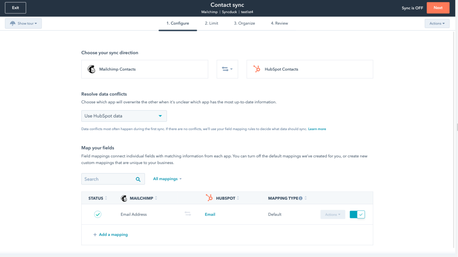 You can set up a one- or two-way sync, which means you can either sync data from Mailchimp to HubSpot, from HubSpot to Mailchimp, or back-and-forth! IMPORTANT: This app requires Data Hub Starter or above.