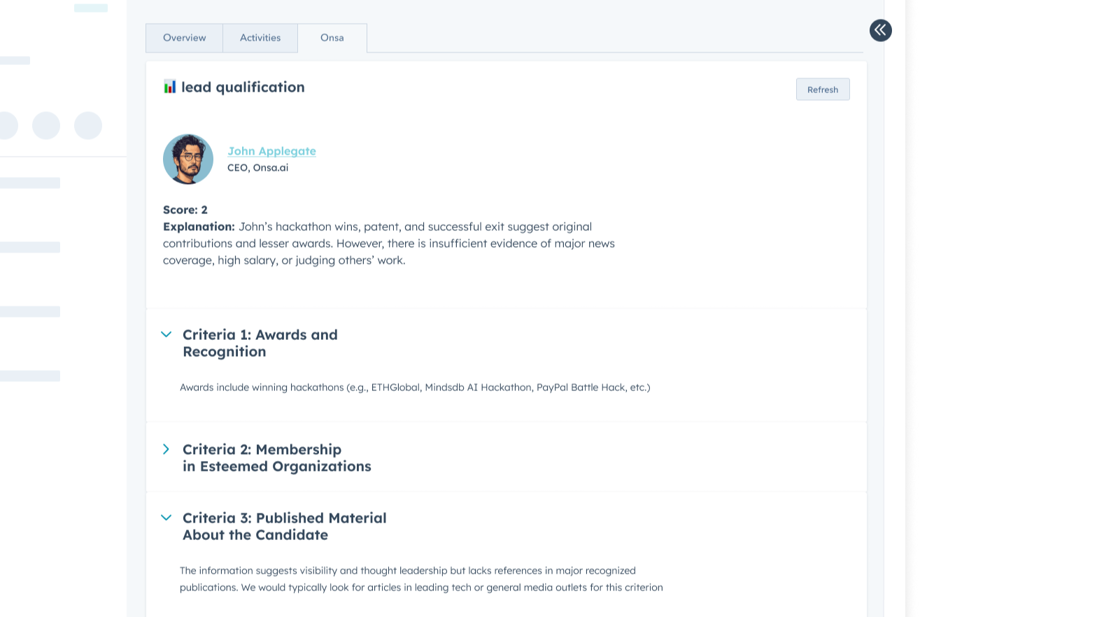 Onsa AI Assistant empowers you with in-depth, AI-driven profiles of your HubSpot contacts — right when you need them. By synthesizing public sources and integrating seamlessly with your HubSpot data, Onsa AI Assistant presents a concise memo so you can walk into every call prepared and confident.