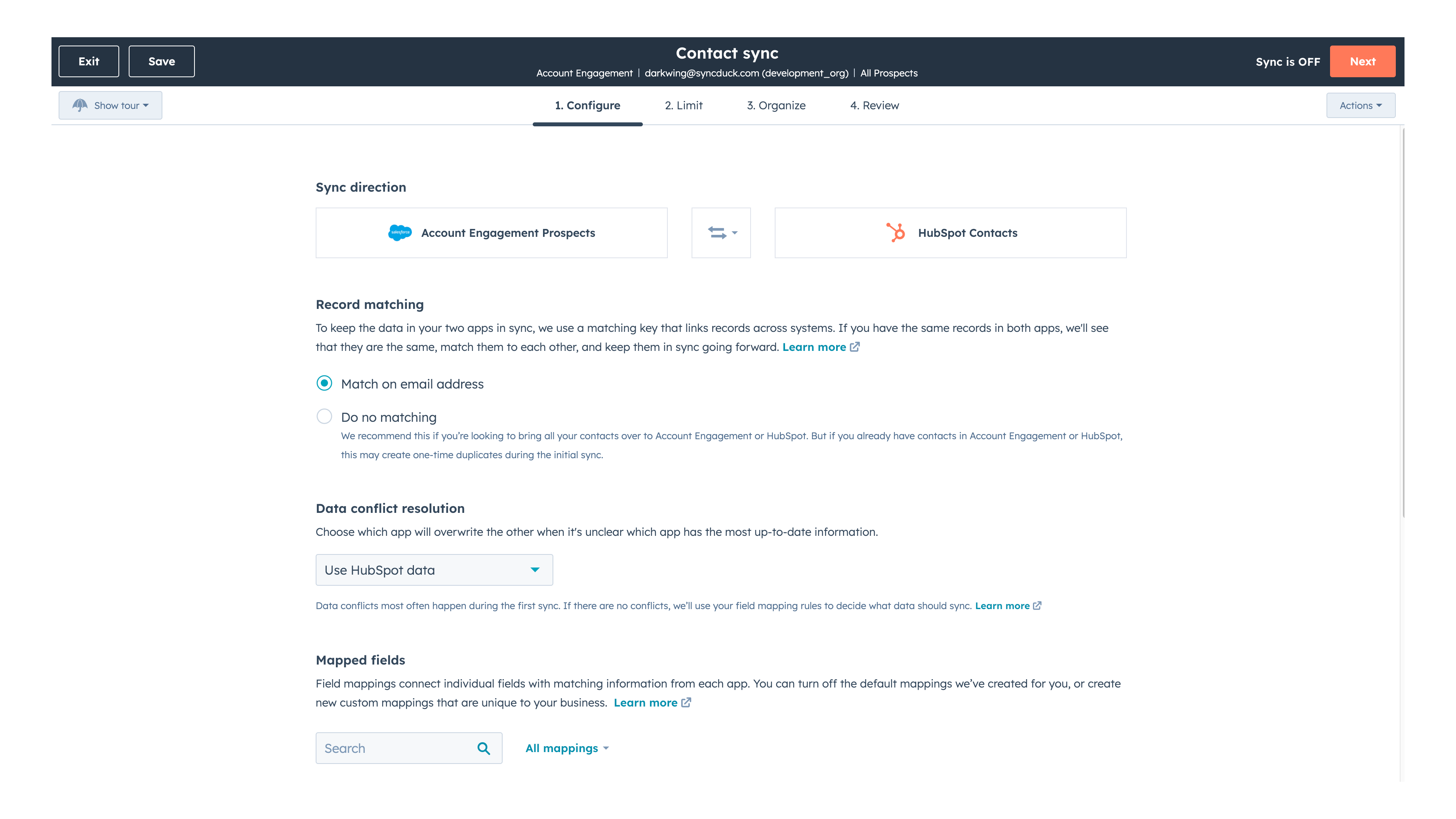 Je kunt een een- of tweerichtingssynchronisatie instellen, wat betekent dat je gegevens kunt synchroniseren van Account Engagement naar HubSpot, van HubSpot naar Account Engagement, of heen-en-weer! Out-of-the-box standaard veldkoppelingen zorgen voor een snelle set-up en houden je gegevens schoon en georganiseerd. Aangepaste veldtoewijzingen zijn beschikbaar met Operations Hub Starter of hoger.