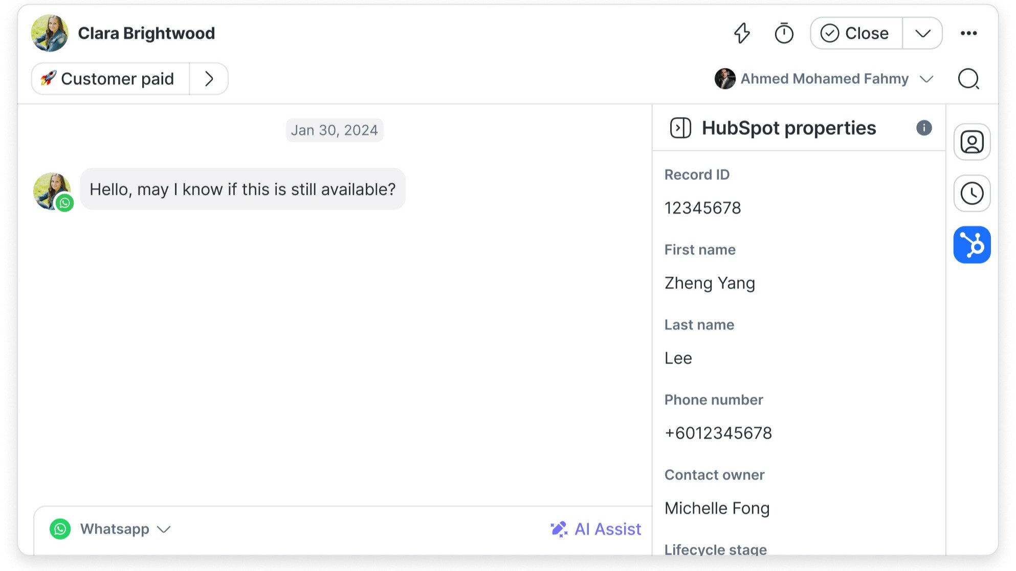 Opening a customer message in respond.io will display their HubSpot records automatically. Instantly see key details like lead status or contact owner to personalize responses effortlessly. You can also customize your view to choose which fields are visible and relevant to your team. Requires Free Tools & CRM plan or higher