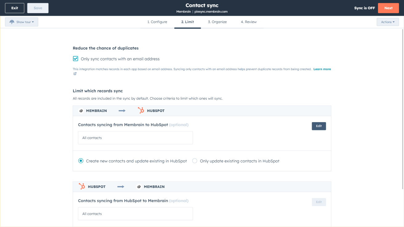 - Two-way sync: Data is shared between Membrain and HubSpot in real time