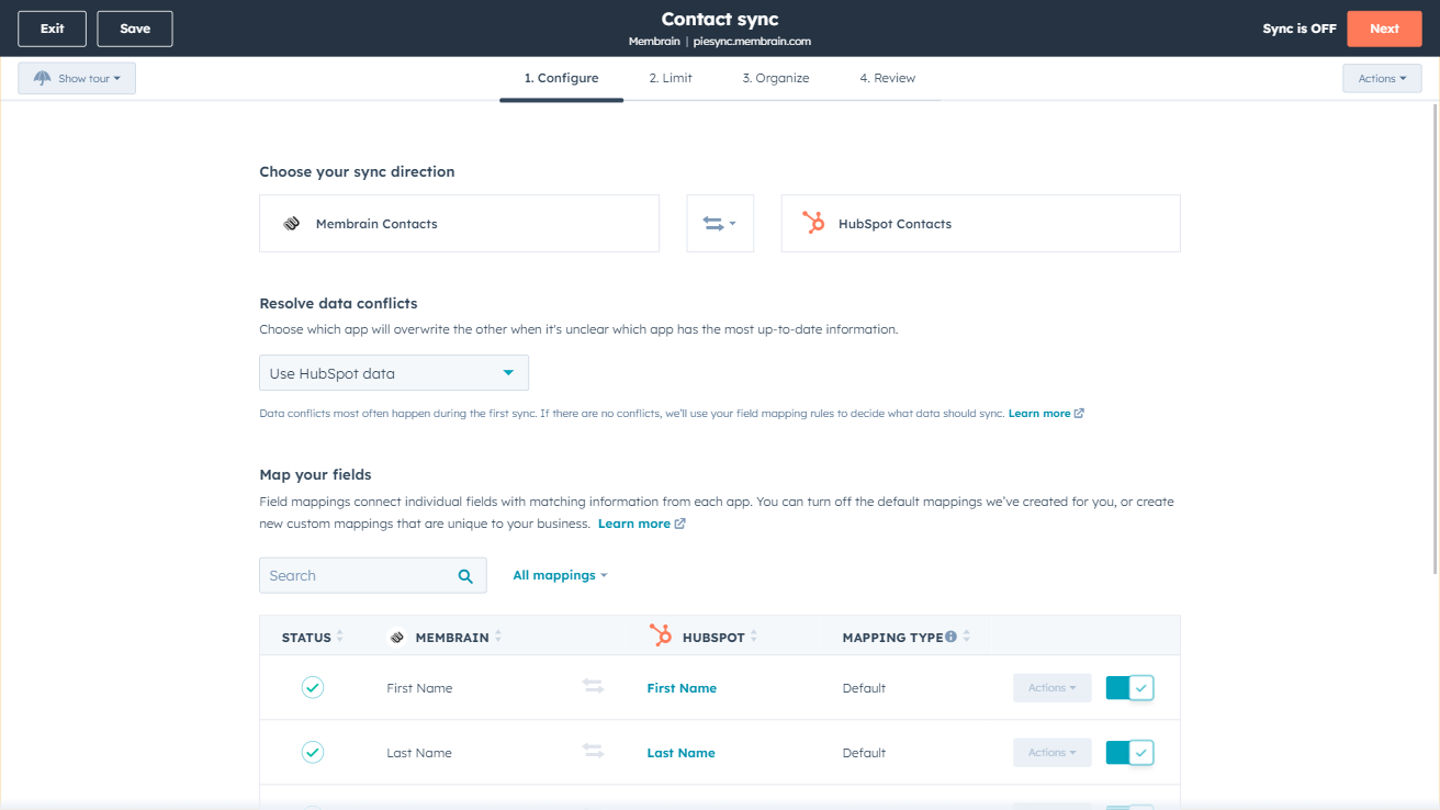 You can set up a one- or two-way sync, which means you can either sync data from Membrain to HubSpot, from HubSpot to Membrain, or back-and-forth! Out-of-the-box default field mappings make set-up quick and keep your data clean and organized. Custom field mappings are available with Data Hub Starter or above.