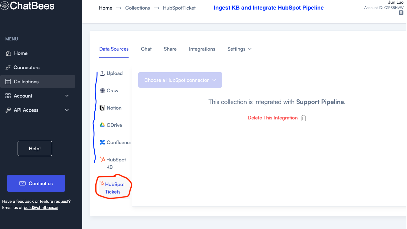 Connect a HubSpot Ticket pipeline. ChatBees immediately begins an automatic scan of your historical tickets and construct a comprehensive Knowledge Graph including Knowledge Base data. The app actively monitors ticket events in real-time. As soon as a ticket is marked as closed, ChatBees automatically incorporates it into the Knowledge Graph.