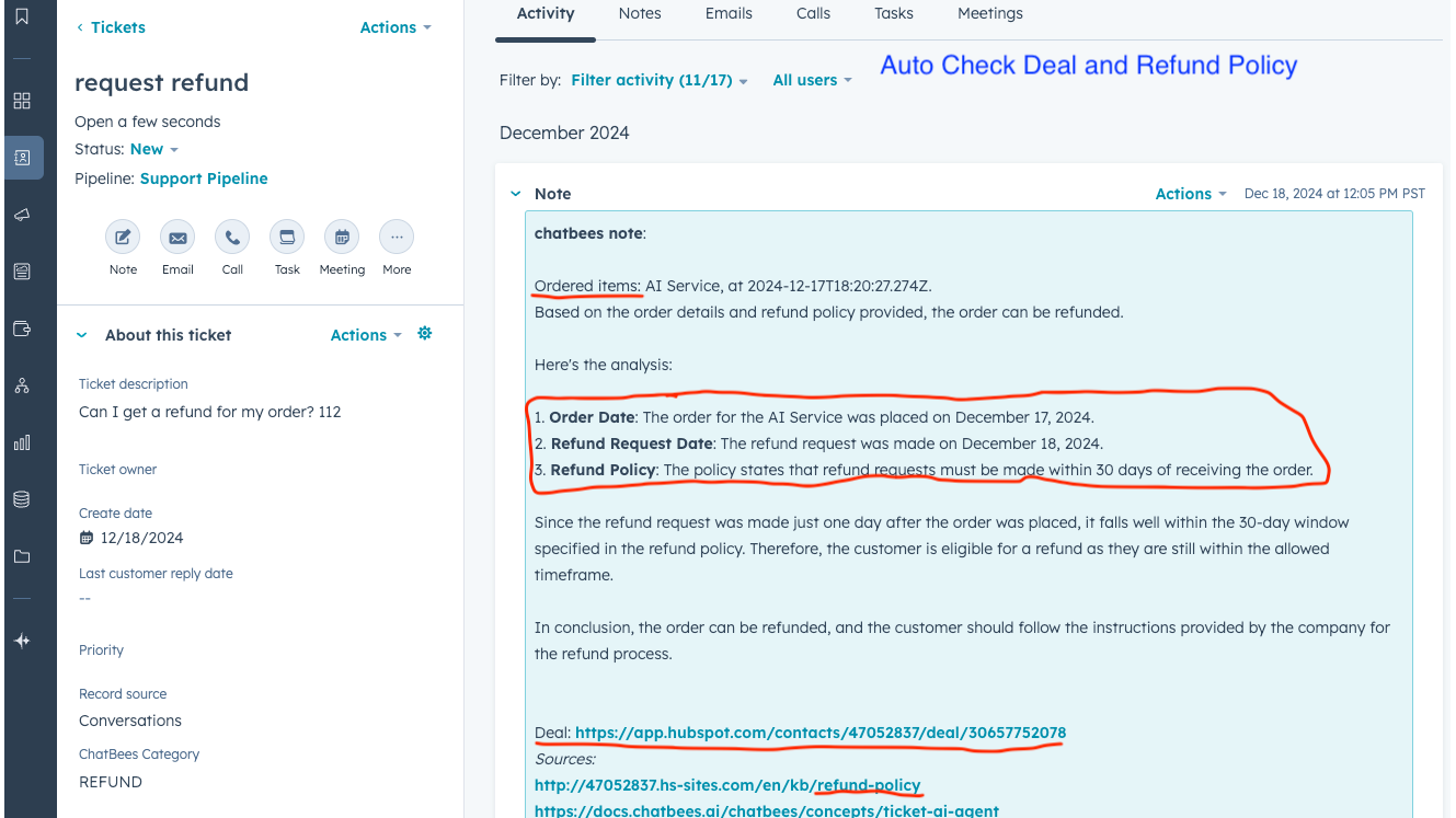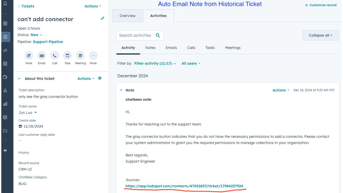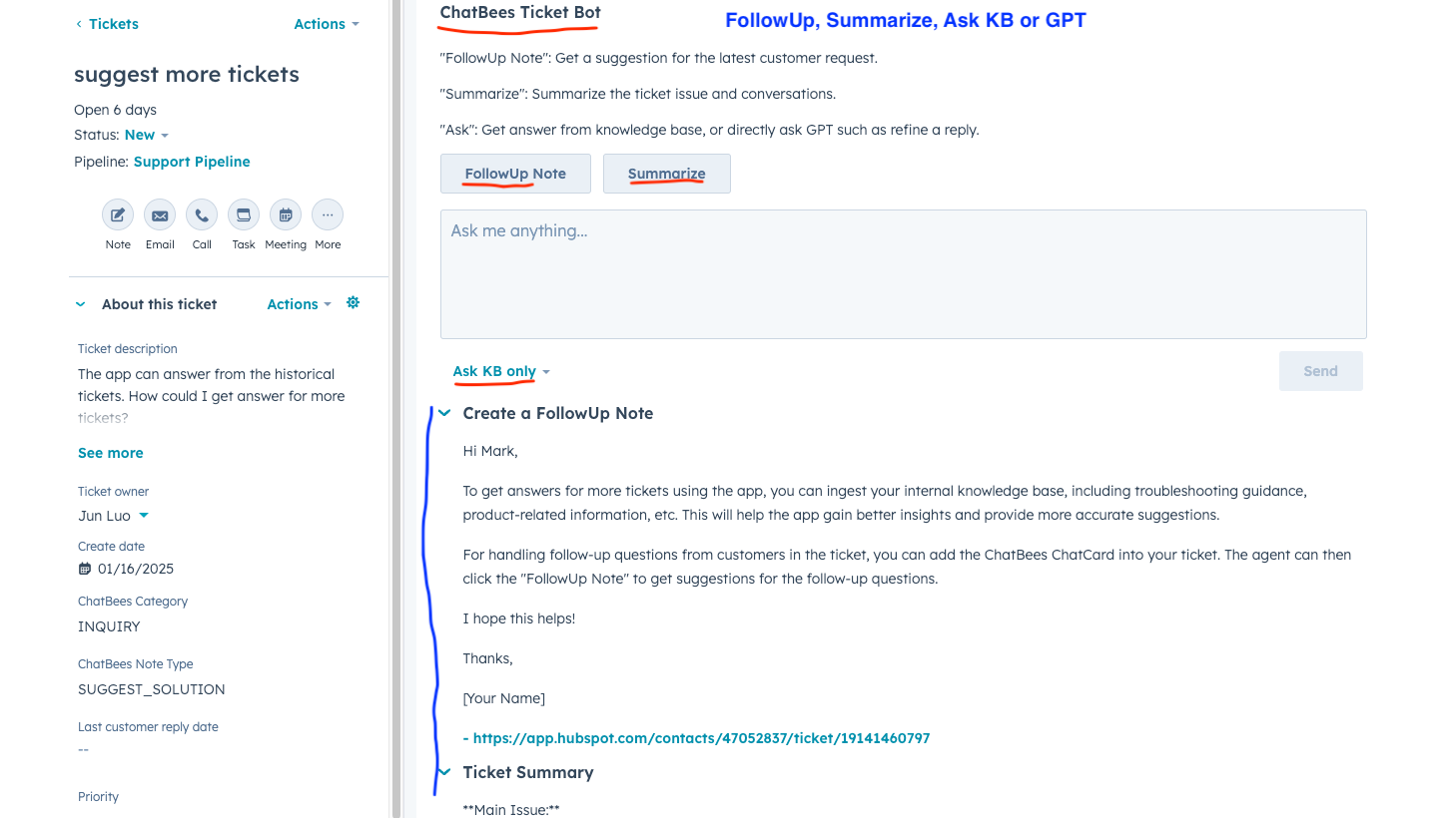 When a new ticket is created in HubSpot, ChatBees springs into action, automatically analyzing the ticket's content. Drawing from the comprehensive Knowledge Graphs, it swiftly generates a suggested resolution, provides support agents with a valuable reference point, offering relevant information and potential solutions at their fingertips.