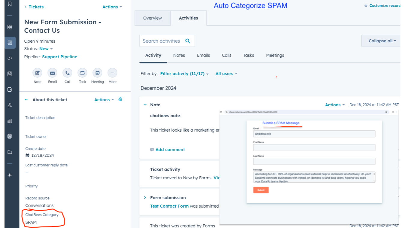 Automatically classify incoming tickets for seamless routing, such as SPAM message via Form submission