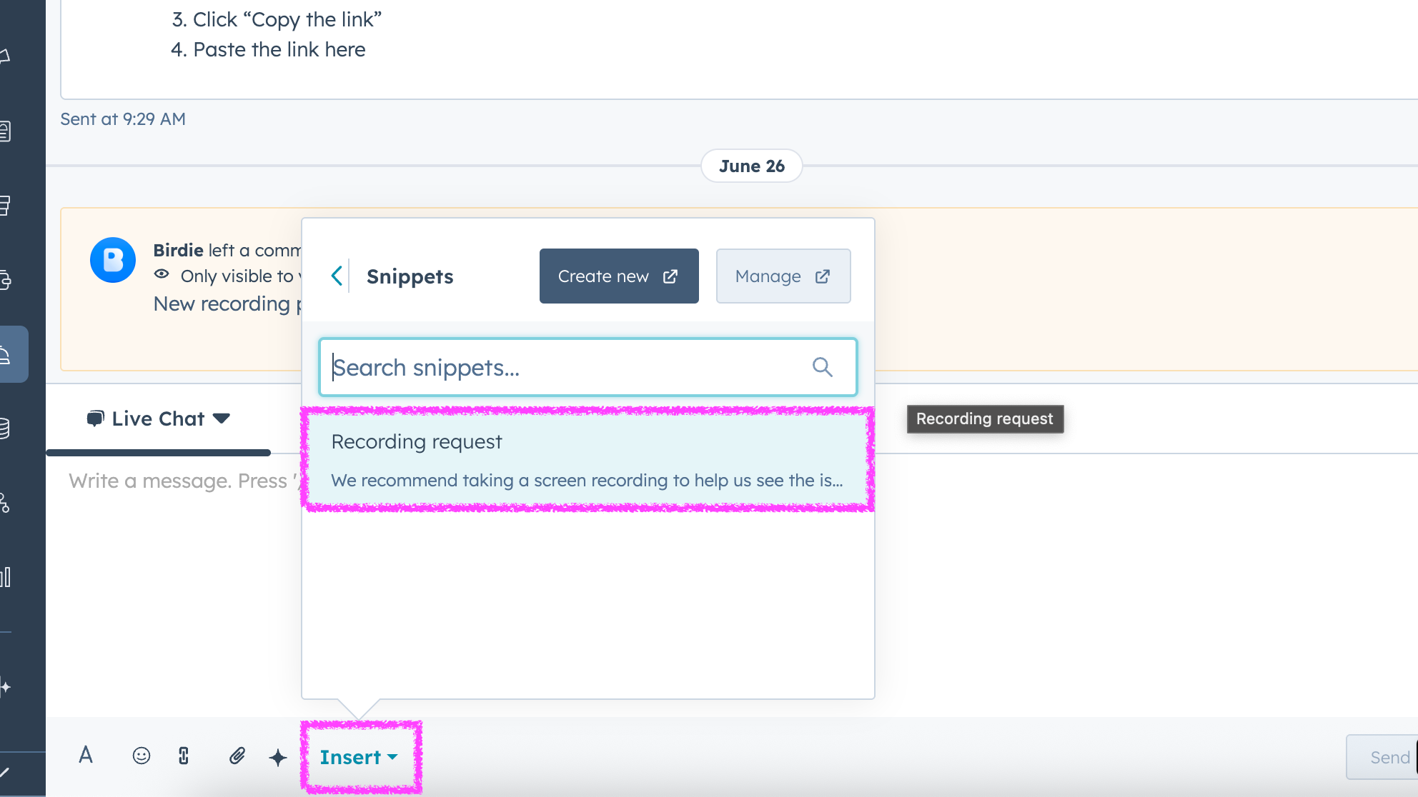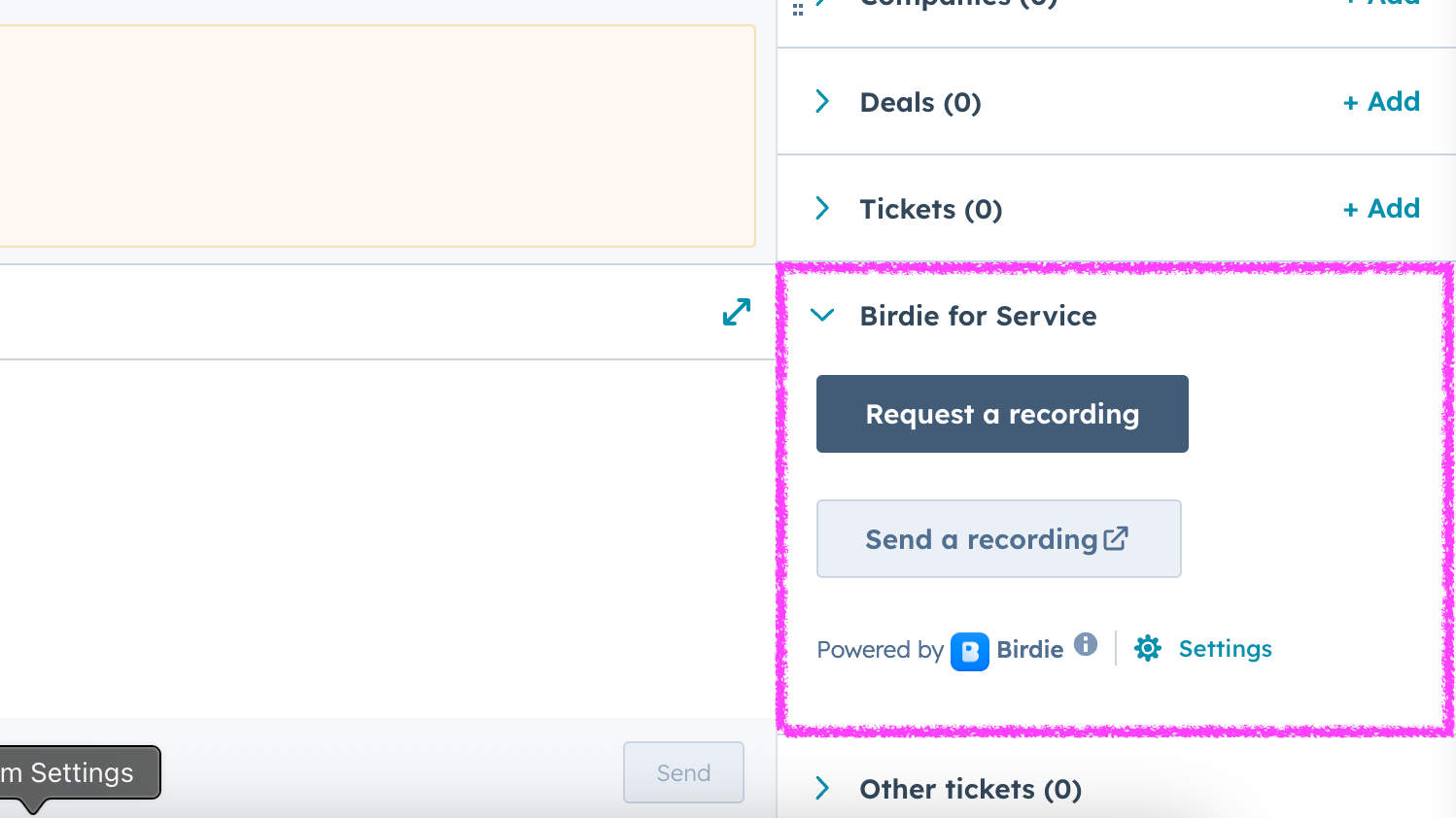 Birdie makes it easy to request screen recordings from customers in HubSpot using Snippets.