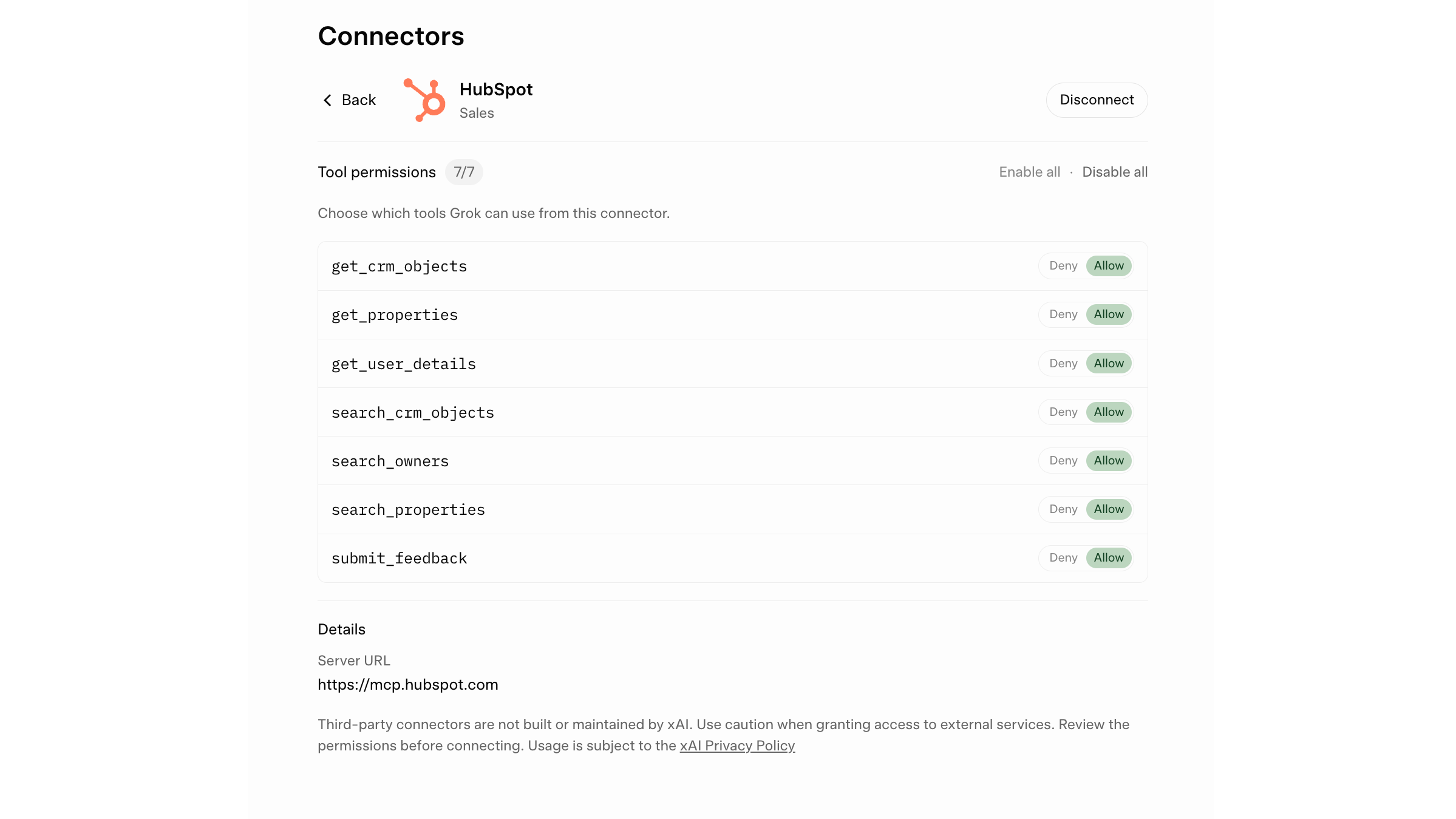 HubSpot-abonnement HubSpot-kontotillatelser Ingen HubSpot-tillatelser kreves. Grok kan be om ekstra tillatelser ved tilkobling. Tilgangstype Personlig Grok-abonnement - SuperGrok eller SuperGrok Heavy-abonnementer