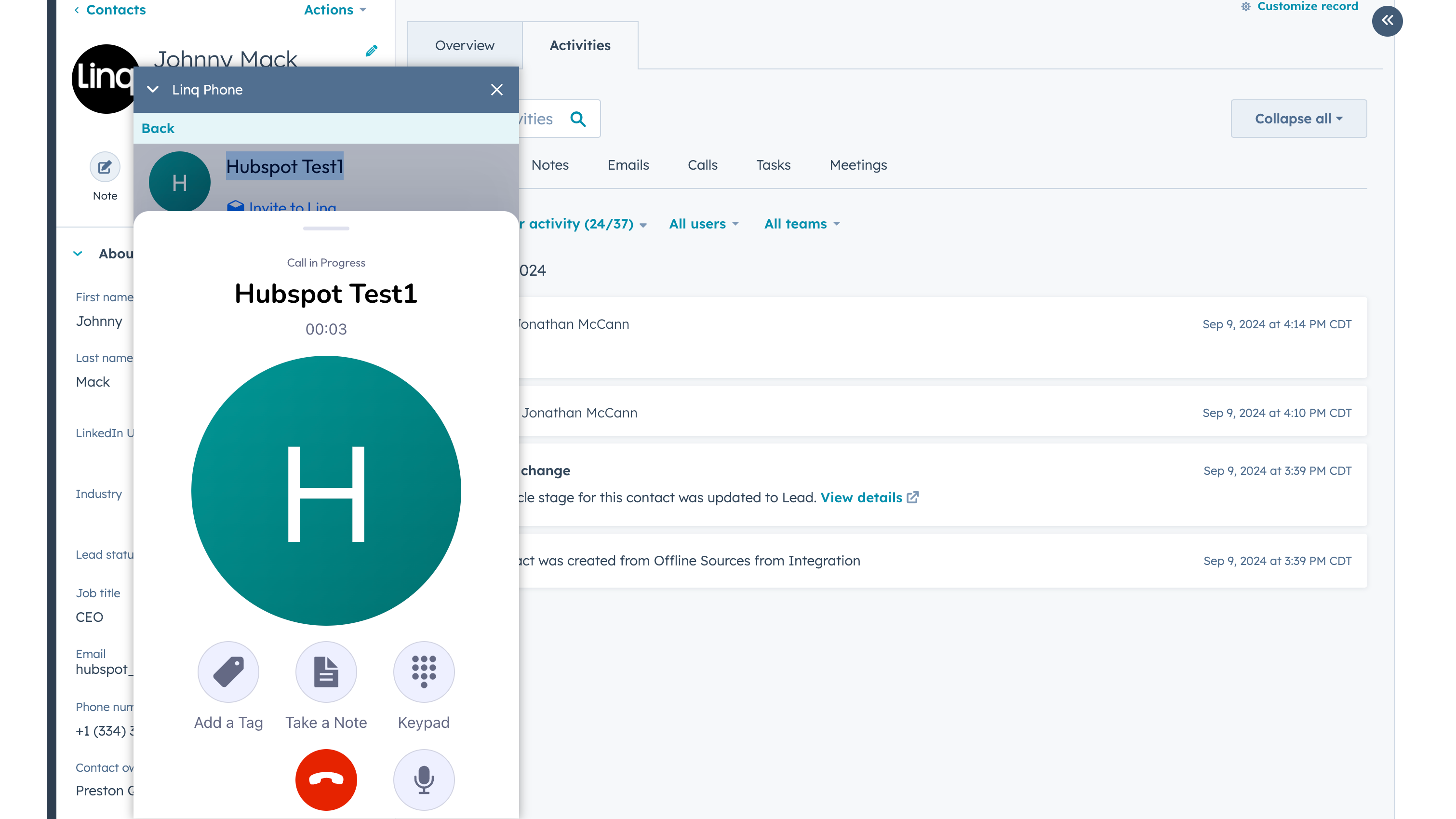 Make calls directly in HubSpot using your Linq phone number. Have recordings, transcriptions, and AI powered insights readily available, synced two ways between HubSpot and Linq.