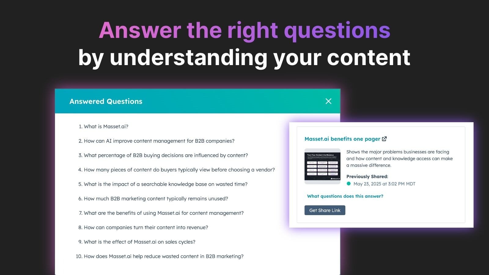 Help overcome objections or concerns by sharing content tailored to specific questions. Use Masset's content analysis engine to determine which objections content overcomes and where it can be used.