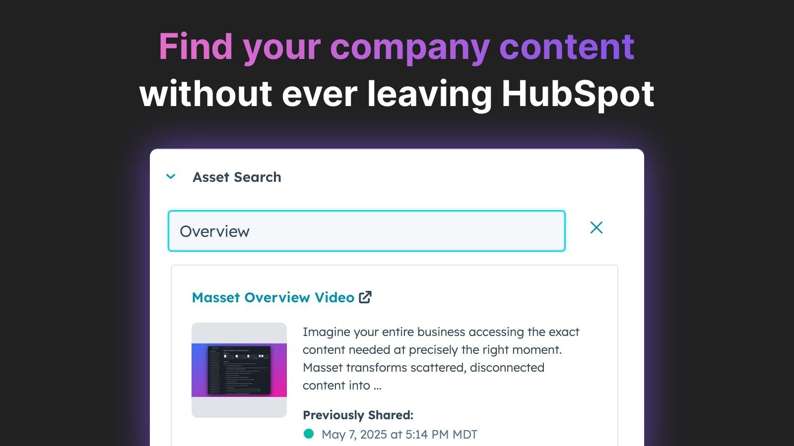 Let your Sales and Marketing teams find the content most likely to help their prospects directly inside of HubSpot. Powered by Masset's AI analysis, results are tailored to your prospect's needs and what will help them progress.
