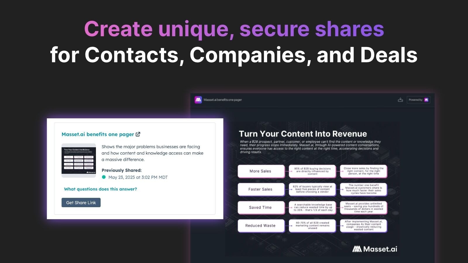 Securely Share Content - Create unique shares for Contacts, Companies, and Deals.