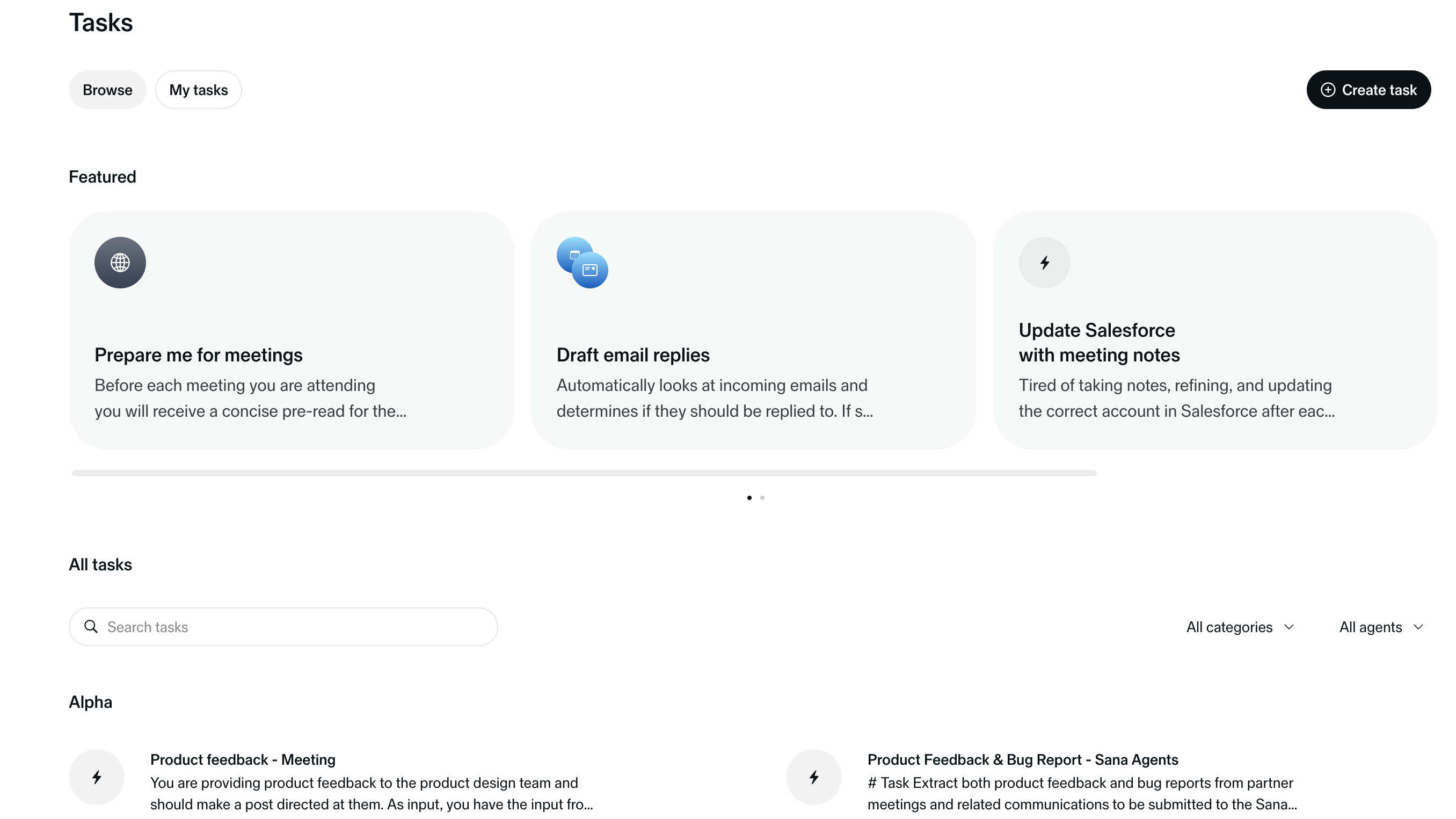 - Get info from Sana without switching apps—just describe what you need in natural language. - Post-Meeting Follow-Ups: Draft emails from recent activity and suggest next steps (e.g., involve legal, schedule pricing review). - Pipeline Reviews: Flag anomalies like frequent close date delays and no-touch deals.
