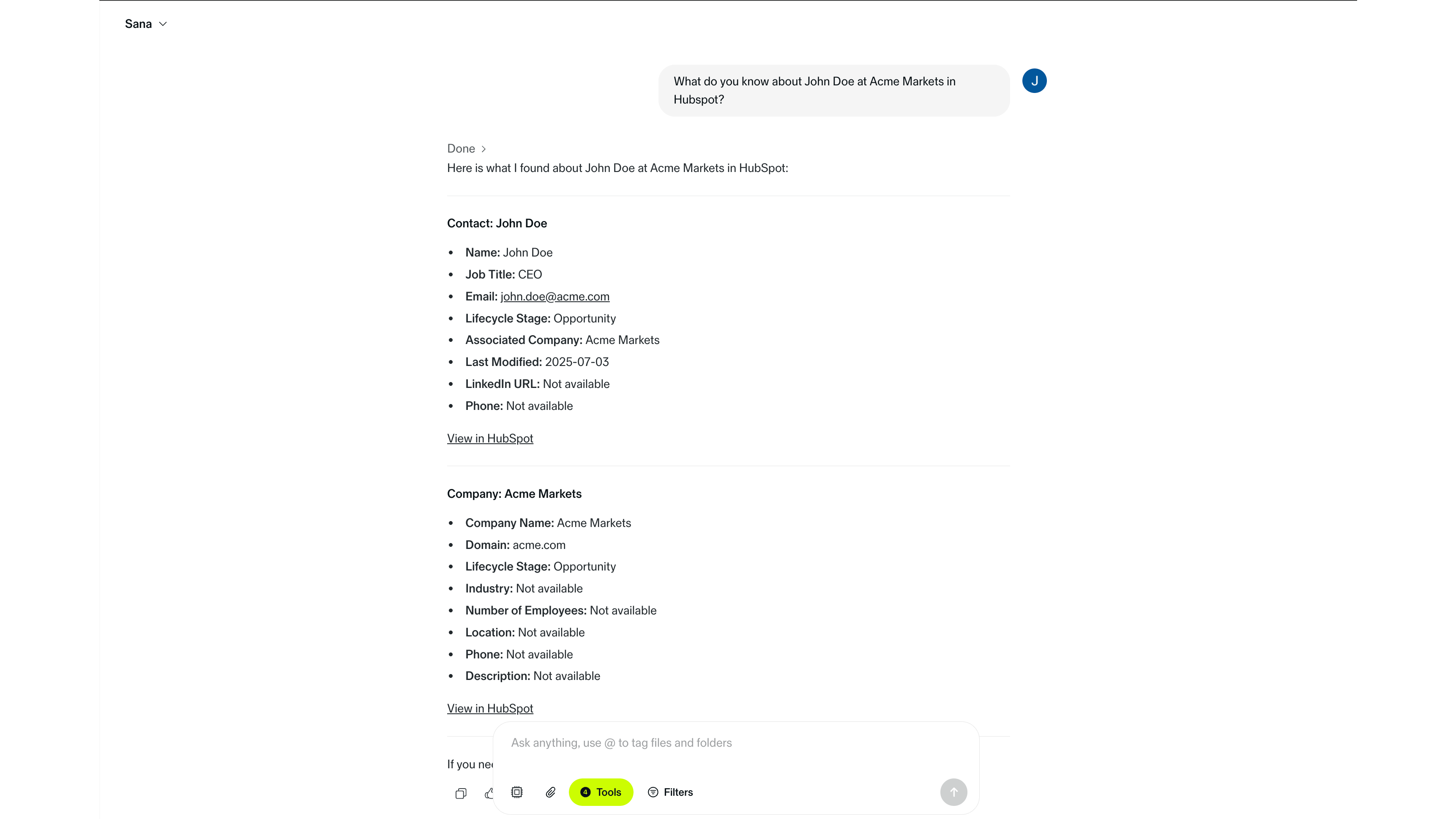 Sana Agents integration to HubSpot improves efficiency and reduces the need to switch between tools as it allows you to search, summarize, and answer queries about contacts, companies and deals directly inside of Sana.