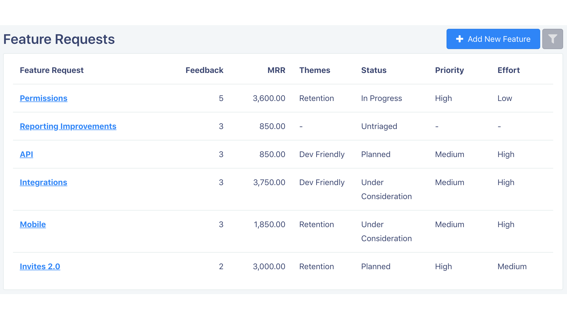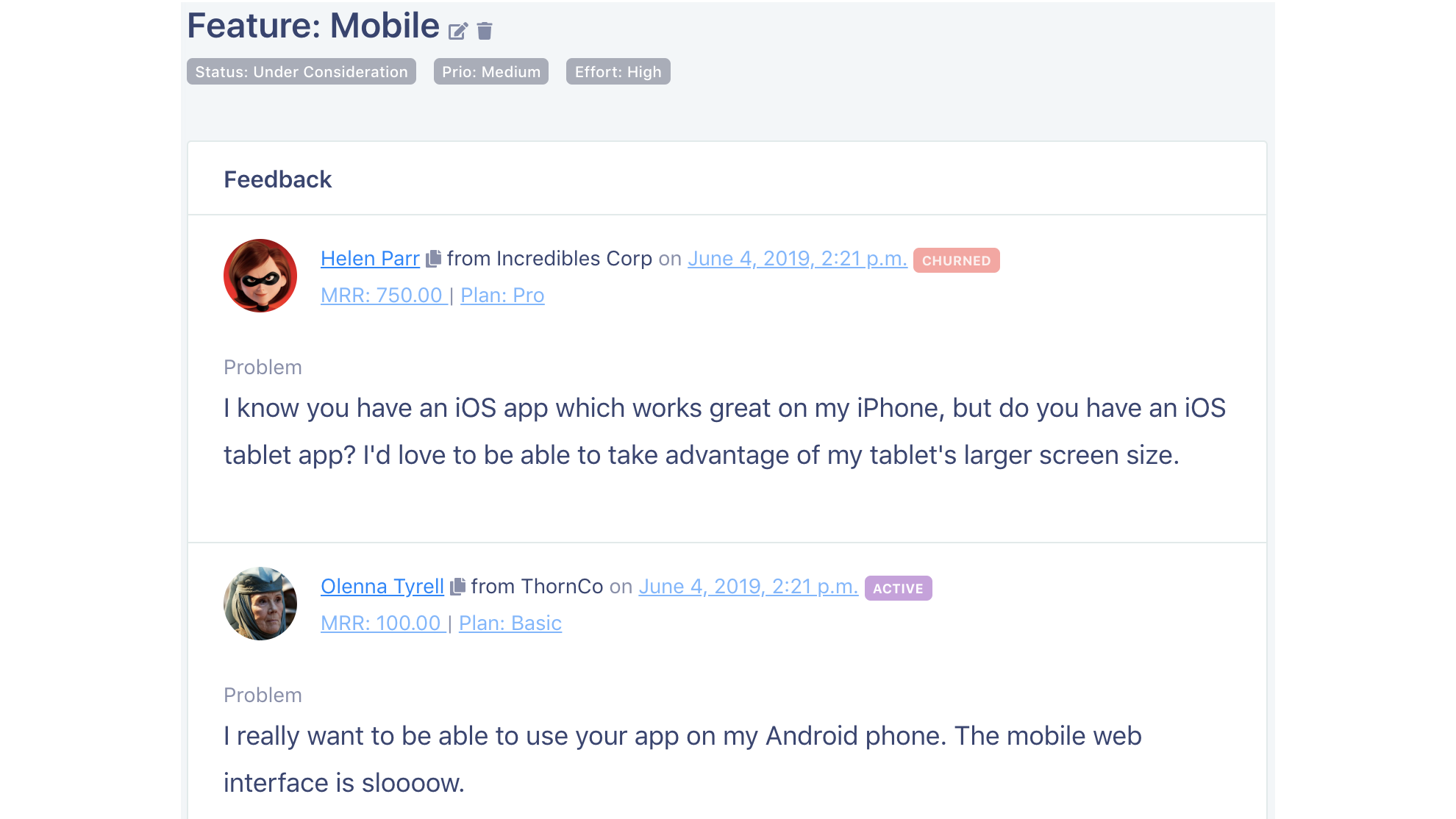 All the feedback about a specific feature request is at your fingertips. No more digging through email, spreadsheets, your CRM, Google Docs (or other tools) to learn what your customers want you to build.