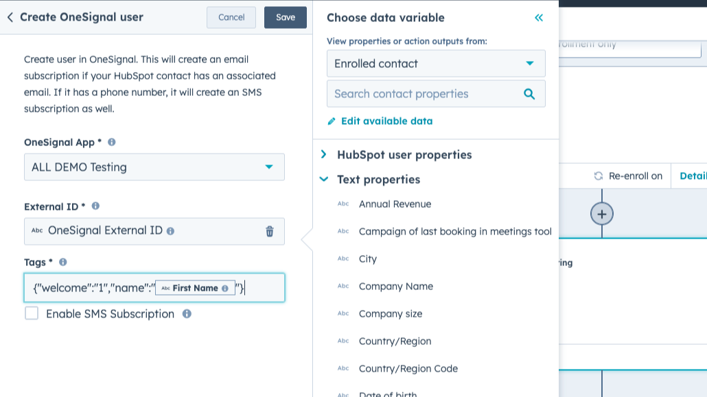 Automatically sync HubSpot contacts with OneSignal whenever a workflow trigger fires. OneSignal can create or update users instantly, letting you queue up personalization details and plan engagement before they interact with your platform. This ensures seamless customer experiences across all messaging channels.