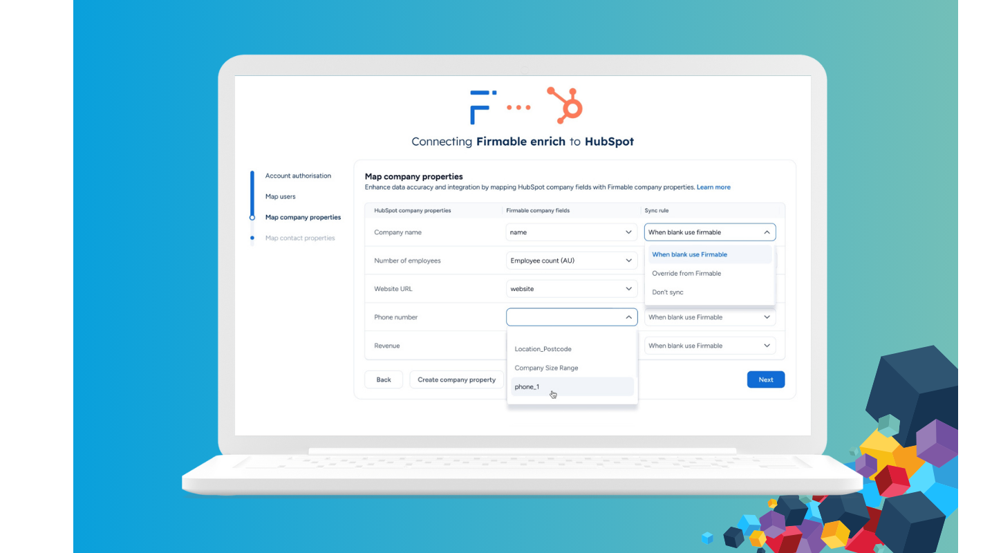 Connect Firmable to your HubSpot account and establish sync rules for how data flows between the two systems. Map the contact and company fields in Firmable with the corresponding contact and company properties in HubSpot, including the ability to create new custom fields.