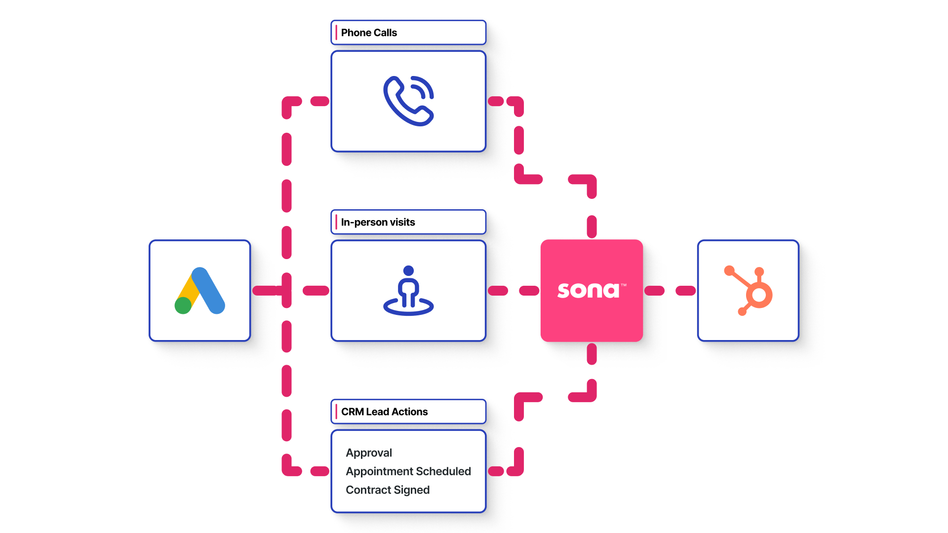 Track online and offline conversions. Capture offline conversions such as calls, demos, or in-store visits, and connect HubSpot CRM data, Sona's advanced tracking, and Google Ads performance data for more complete journey visibility. Sync your offline conversion data with Google Ads to ensure you're attributing leads, no matter how they convert.