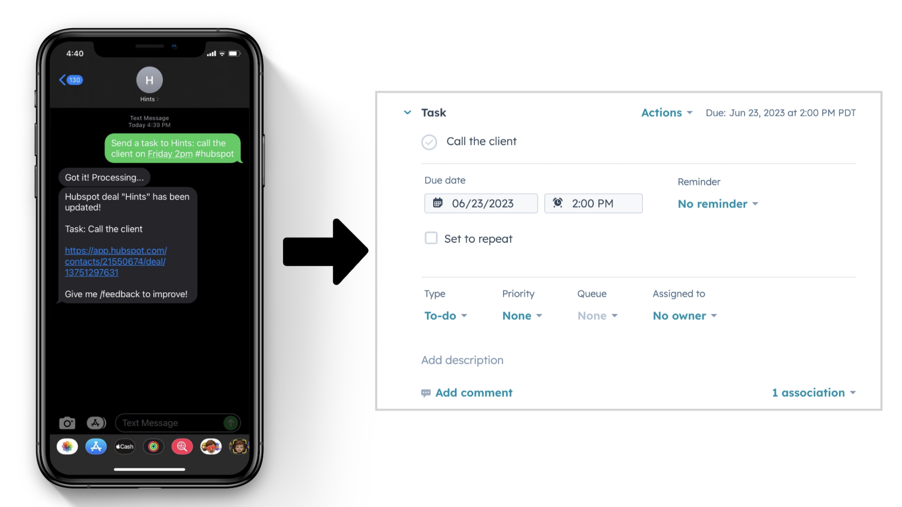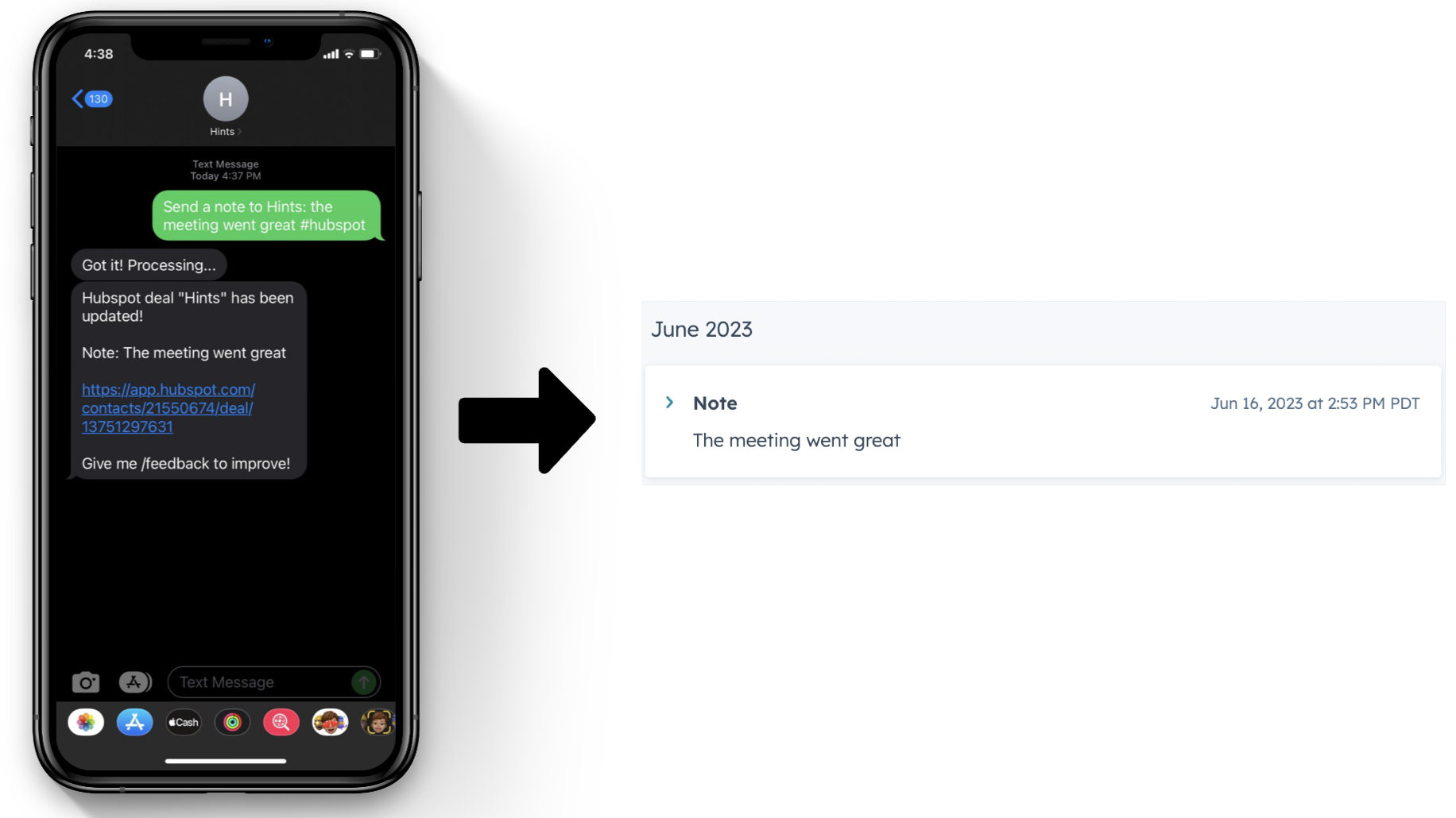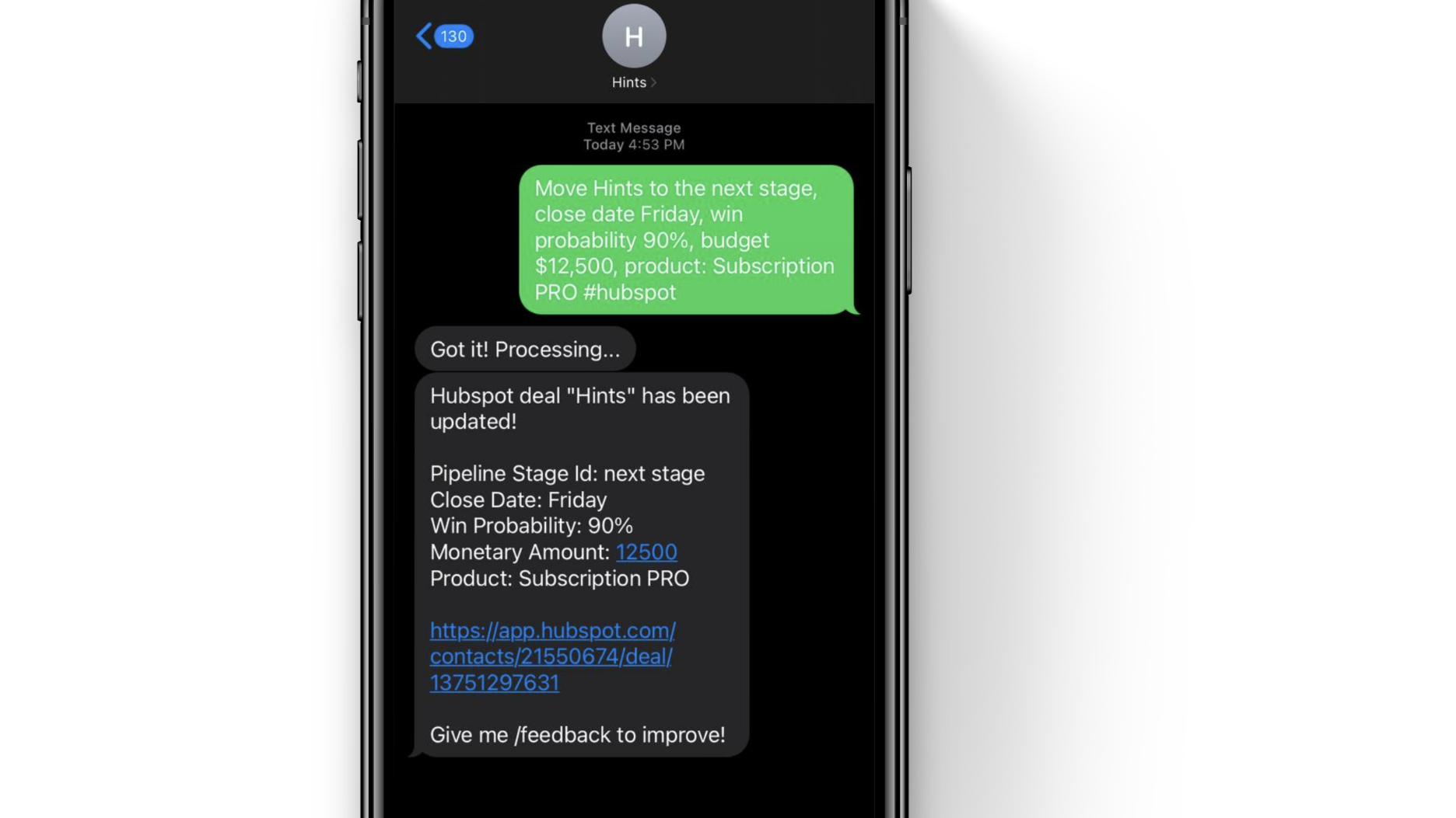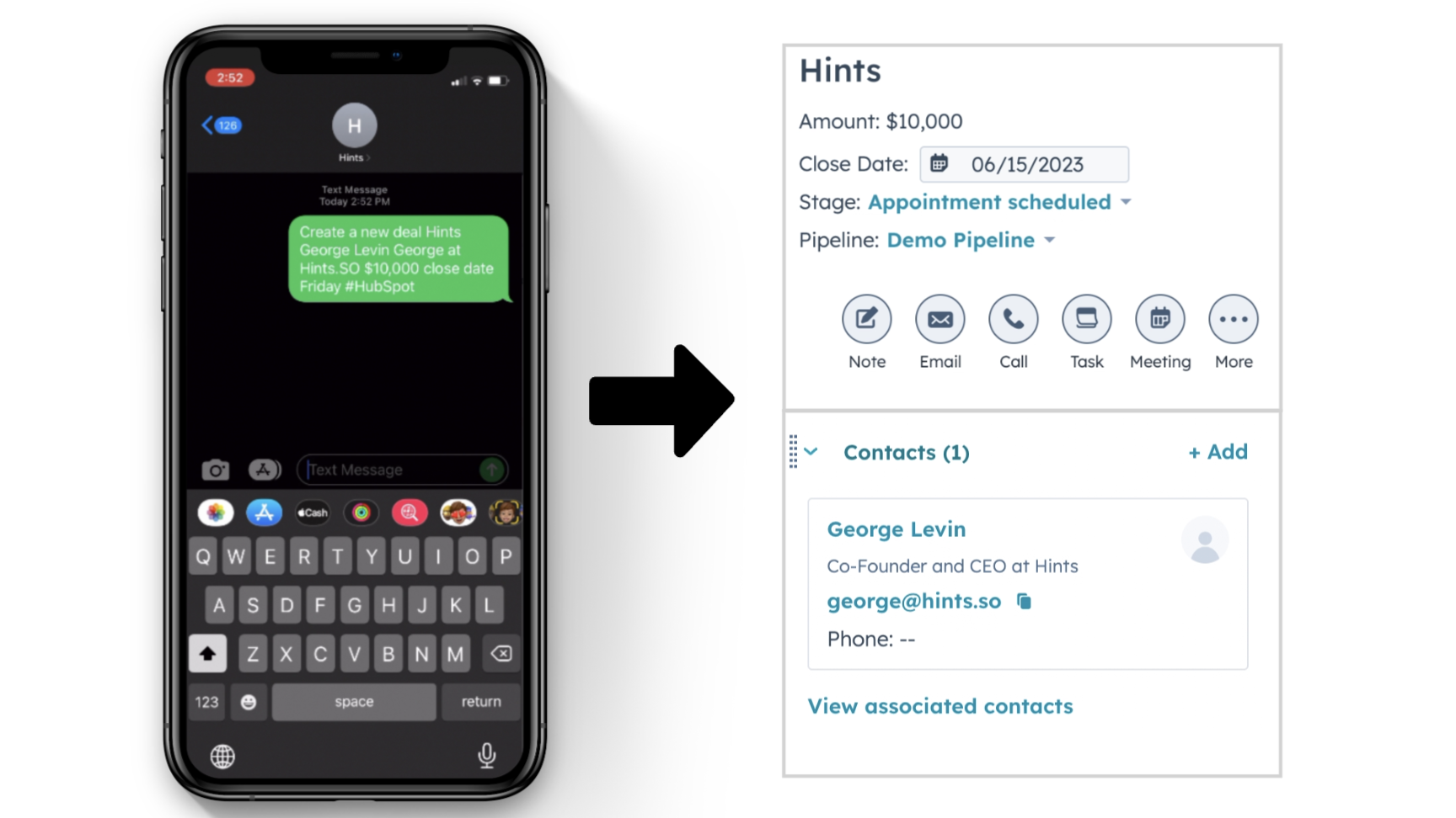Hints AI sales assistant effectively reduces CRM administrative tasks by managing and updating deals and contacts within HubSpot via SMS or WhatsApp's text and voice messages. It uses AI to streamline sales operations, including note-taking, task organization, and call logging