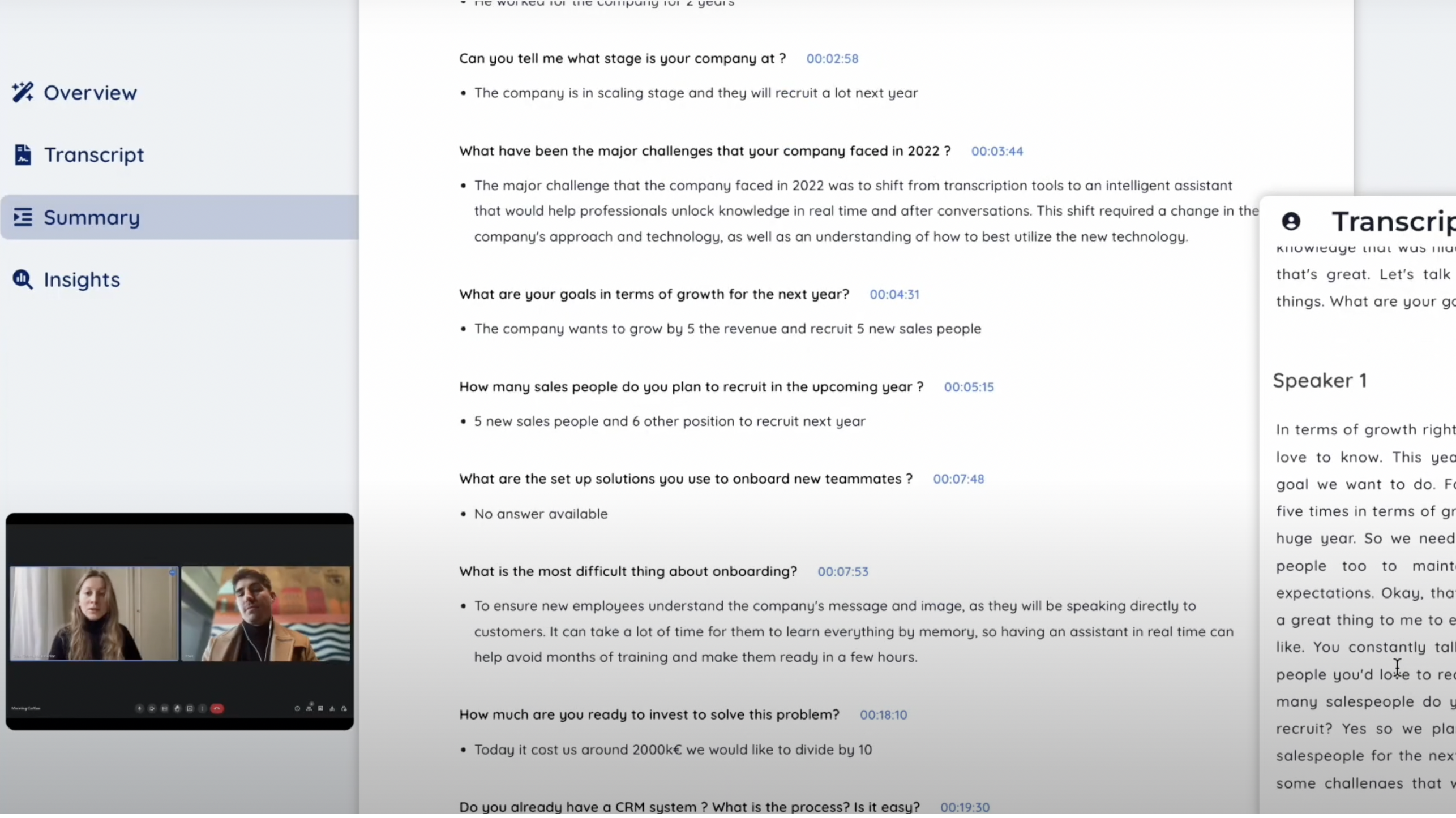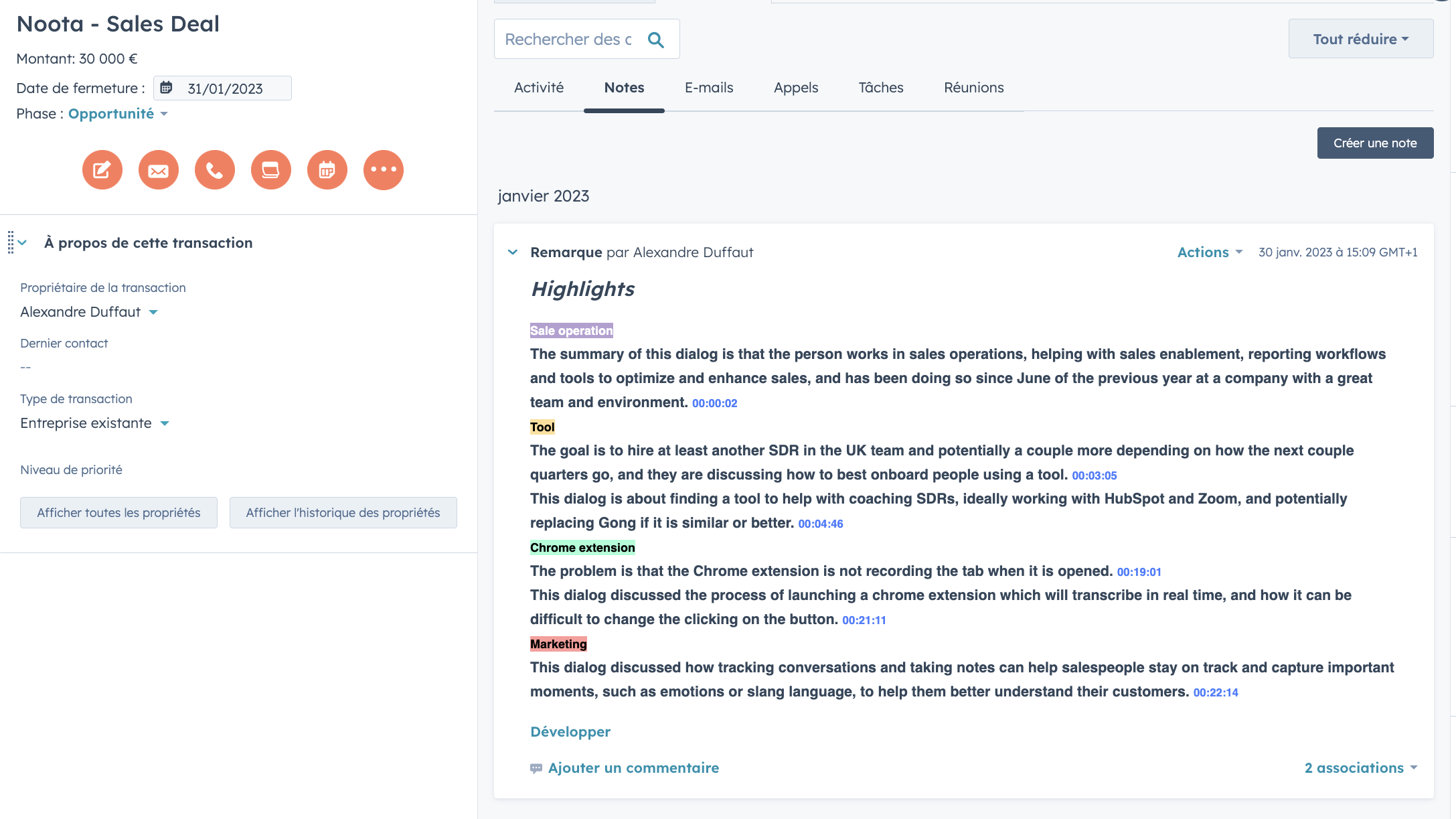 After recording your meeting, receive in your CRM the summary of the discussion in your deals notes associated with your contact. If the contact or the deal does not exist they will be automatically created for you.