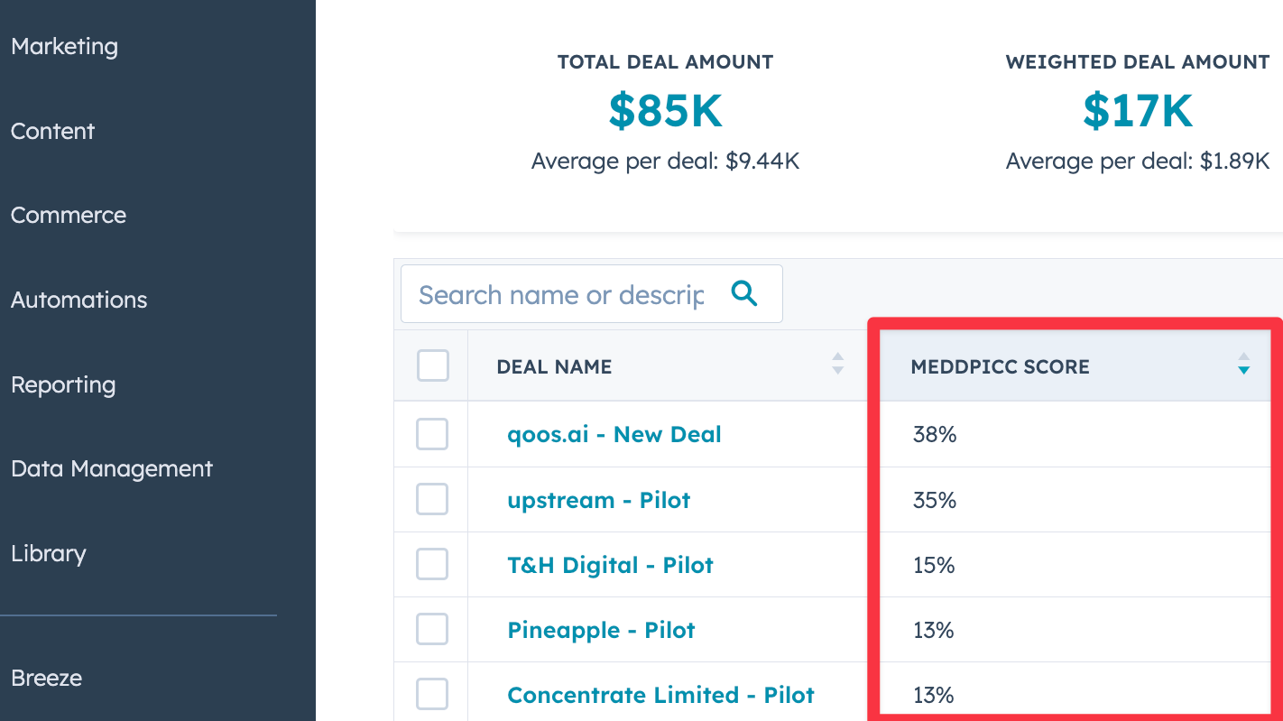 Embed sales qualification frameworks such as MEDDPICC into your sales teams flow of work and create opportunity scores into HubSpot Deals through the Qoos integration with HubSpot. As your sales teams progress their deals, the deal qualification score will increase and be visible within the HubSpot Deal Dashboard.
