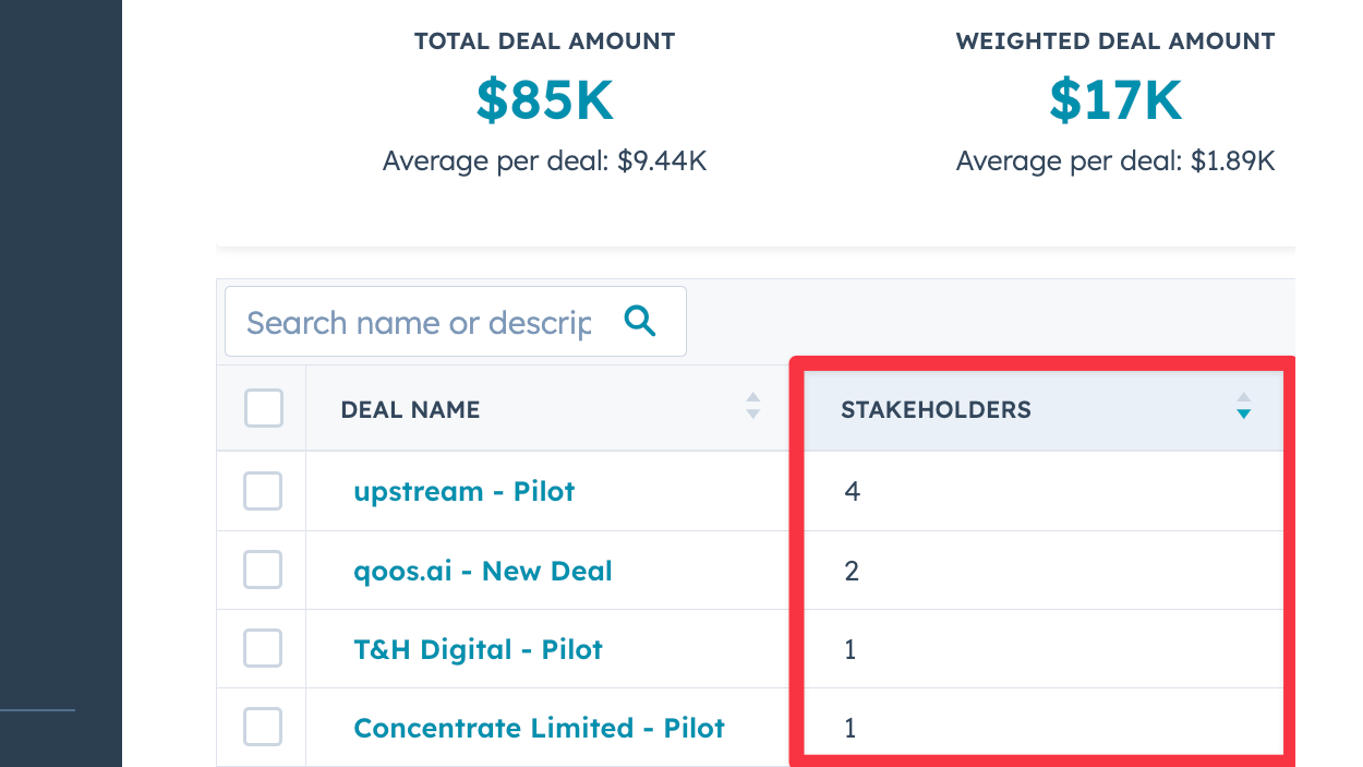 See how many stakeholders have been added to the Qoos Stakeholder Engagement Map via the Qoos integration into HubSpot Deals. Stakeholder personas include Champions, Blockers, Economic Buyer, Influencers and more.