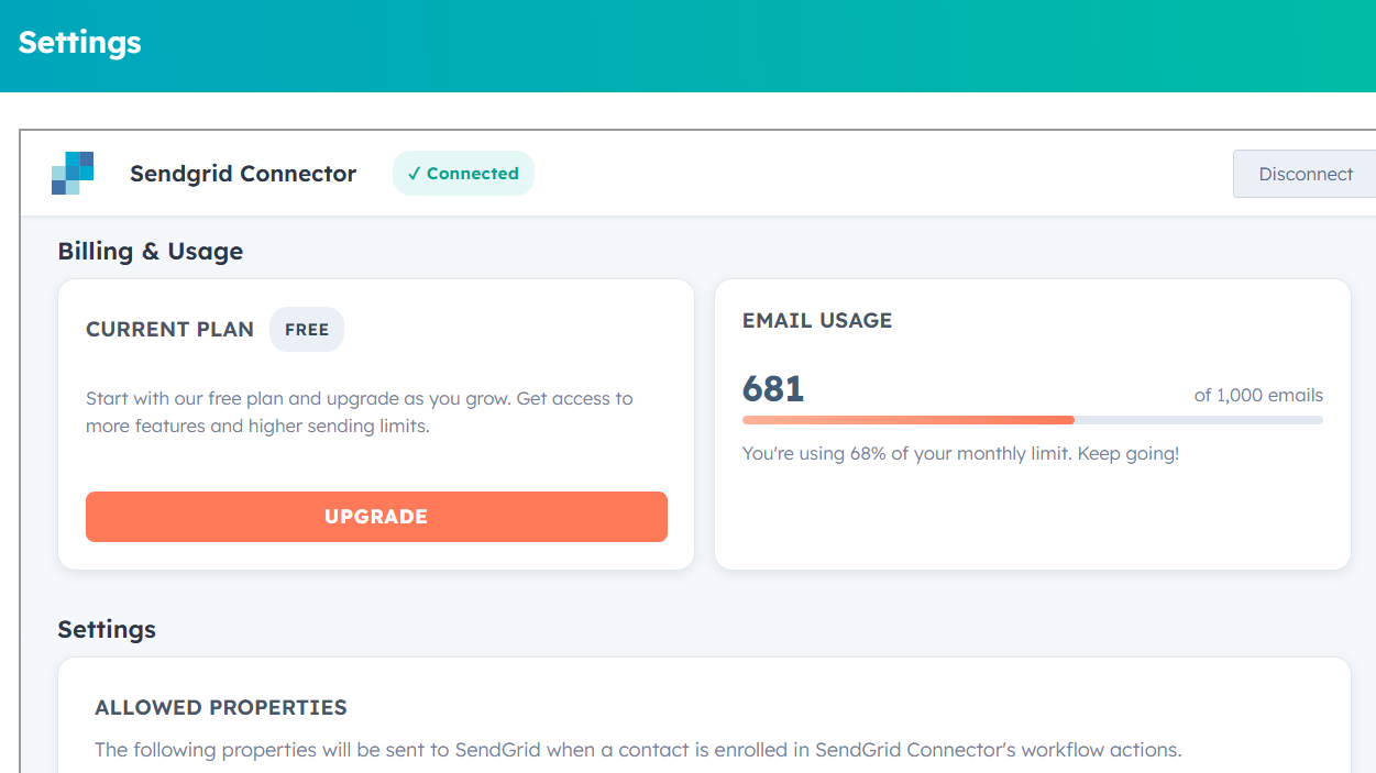 SendGridConnector umożliwia dodawanie akcji SendGrid do przepływów pracy HubSpot, dzięki czemu można bezpiecznie wysyłać zautomatyzowane wiadomości e-mail do kontaktów HubSpot bezpośrednio z istniejących automatyzacji HubSpot.