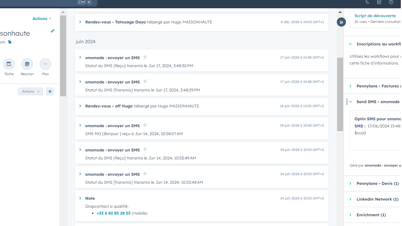 Depuis la fiche client HubSpot, vous pouvez suivre vos envois. L'historique des messages envoyés et reçus (dont le STOP SMS) remontent directement sur la fiche client que ce soit dans l'activité ou dans l'environnement smsmode de la fiche client.