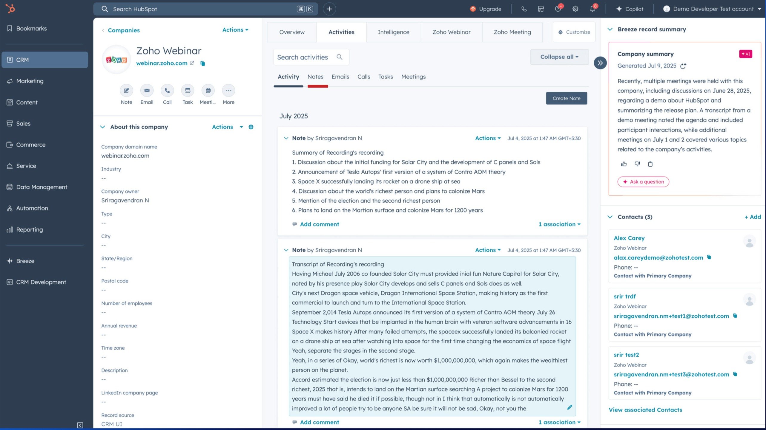 The HubSpot CRM integration with Zoho Webinar automates data synchronization by syncing registrant and attendee details directly into the CRM, creating a centralized repository of contacts enriched with timeline events and engagement metrics, thereby helping your sales and support teams stay aligned and follow up effectively within your HubSpot workspace.