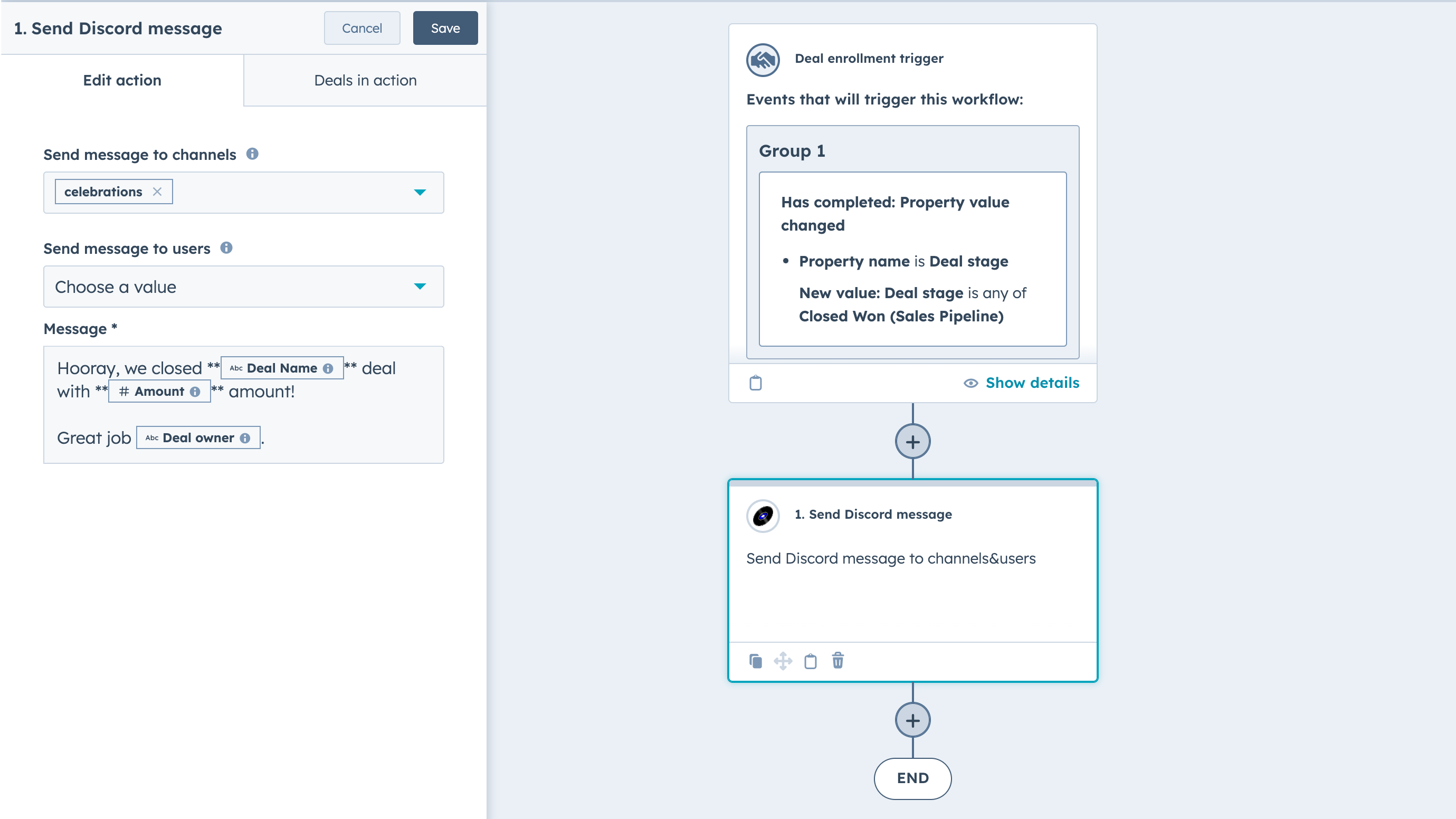 Set up HubSpot Workflows to send notifications to Discord channel or user.