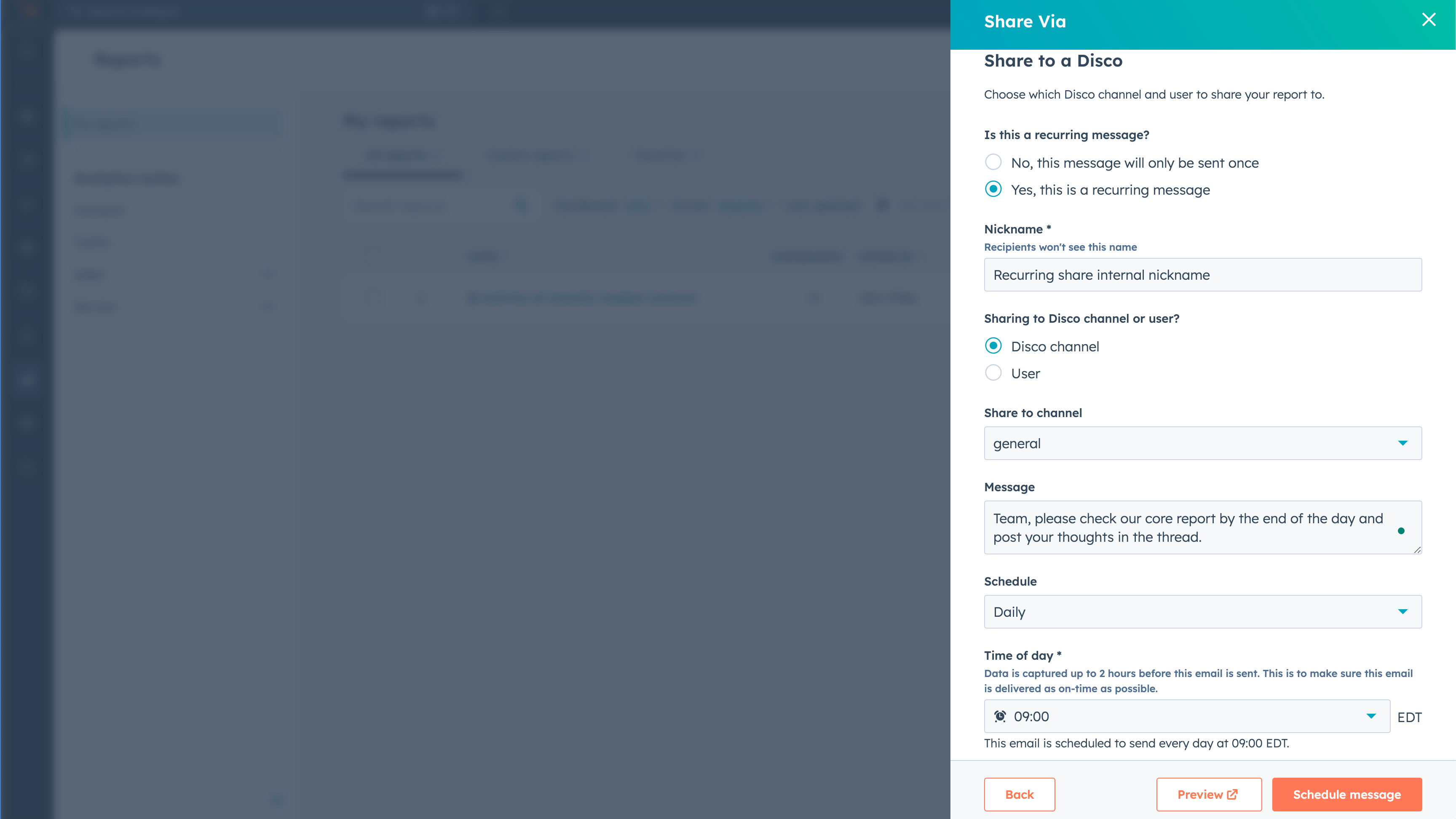 One-off and recurring report sharing directly from HubSpot UI to Discord