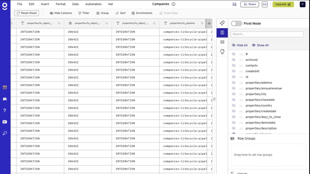 The Gigasheet HubSpot App offers straightforward data exploration, analysis, and data cleaning tools in a familiar interface. Gigasheet gives your team powerful, highly scalable data tools in a spreadsheet-like UI. Benefit from the ability to wrangle massive datasets, apply data transformations, and use a variety of data cleaning and enrichment options to refine and organize your data efficiently. Once processed, export the cleaned, enriched, or newly generated data back into HubSpot to enhance accuracy and decision-making. Great for migrations or general hygiene and cleanup.