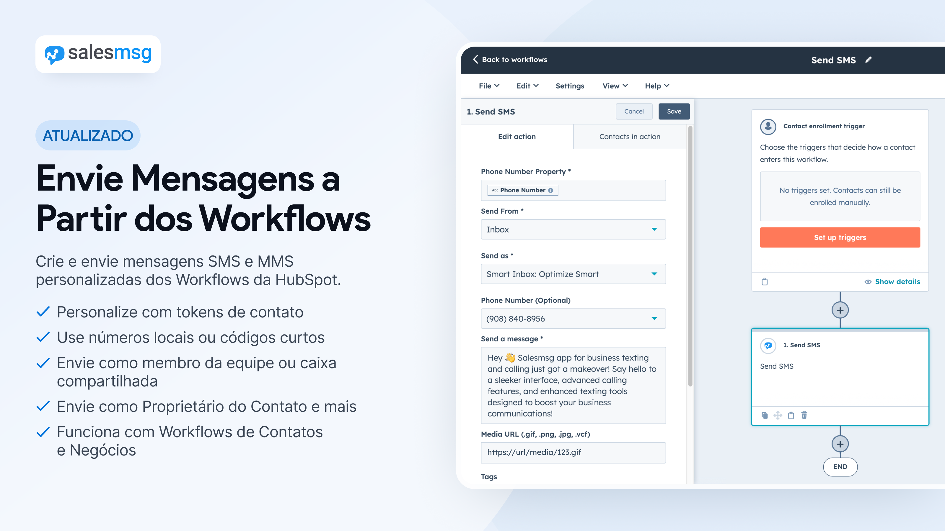 Adicione facilmente textos personalizados em QUALQUER fluxo de trabalho do HubSpot (contatos, tíquetes ou negócios) ou acione fluxos de trabalho com tags Salesmsg. Com a simples adição de uma mensagem de texto, você pode aumentar os resultados de qualquer fluxo de trabalho existente em sua empresa.