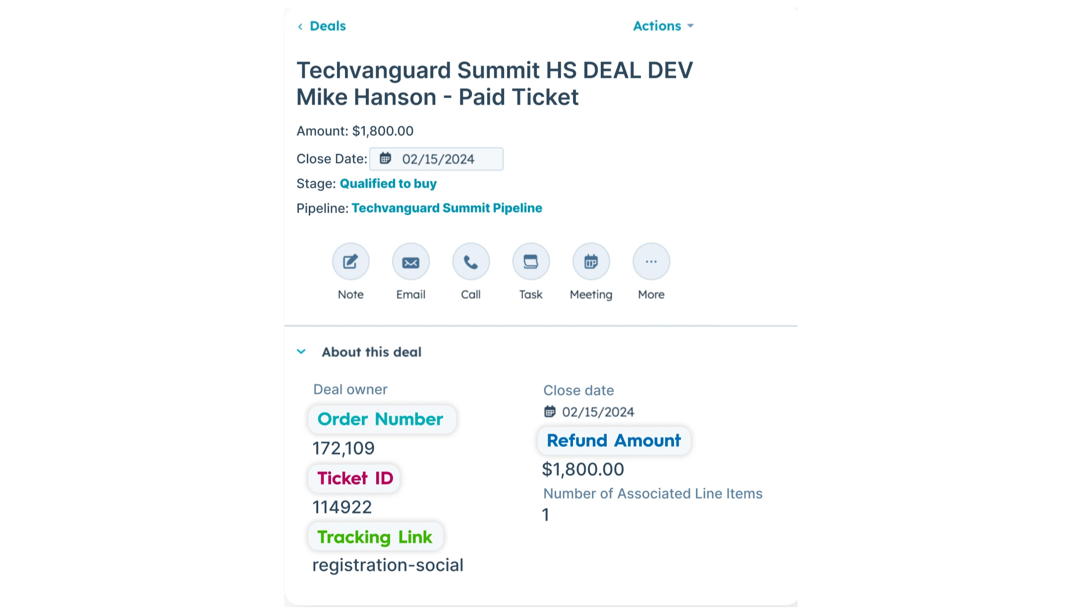 HubSpot Deals can automatically be created when there's a new order in Accelevents. The deal can include line items, and you can map other fields like the order number, ticket numbers, and even the tracking link used for the purchase.