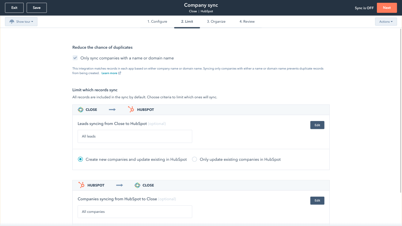 You’re in control of your data. You can set up a one- or two-way sync, which means you can either sync data from only one app to the other or back-and-forth between both apps. You can also add a filter for any Close field (like Opportunity Count or Status) or HubSpot list to sync exactly what you want—and nothing you don’t.
