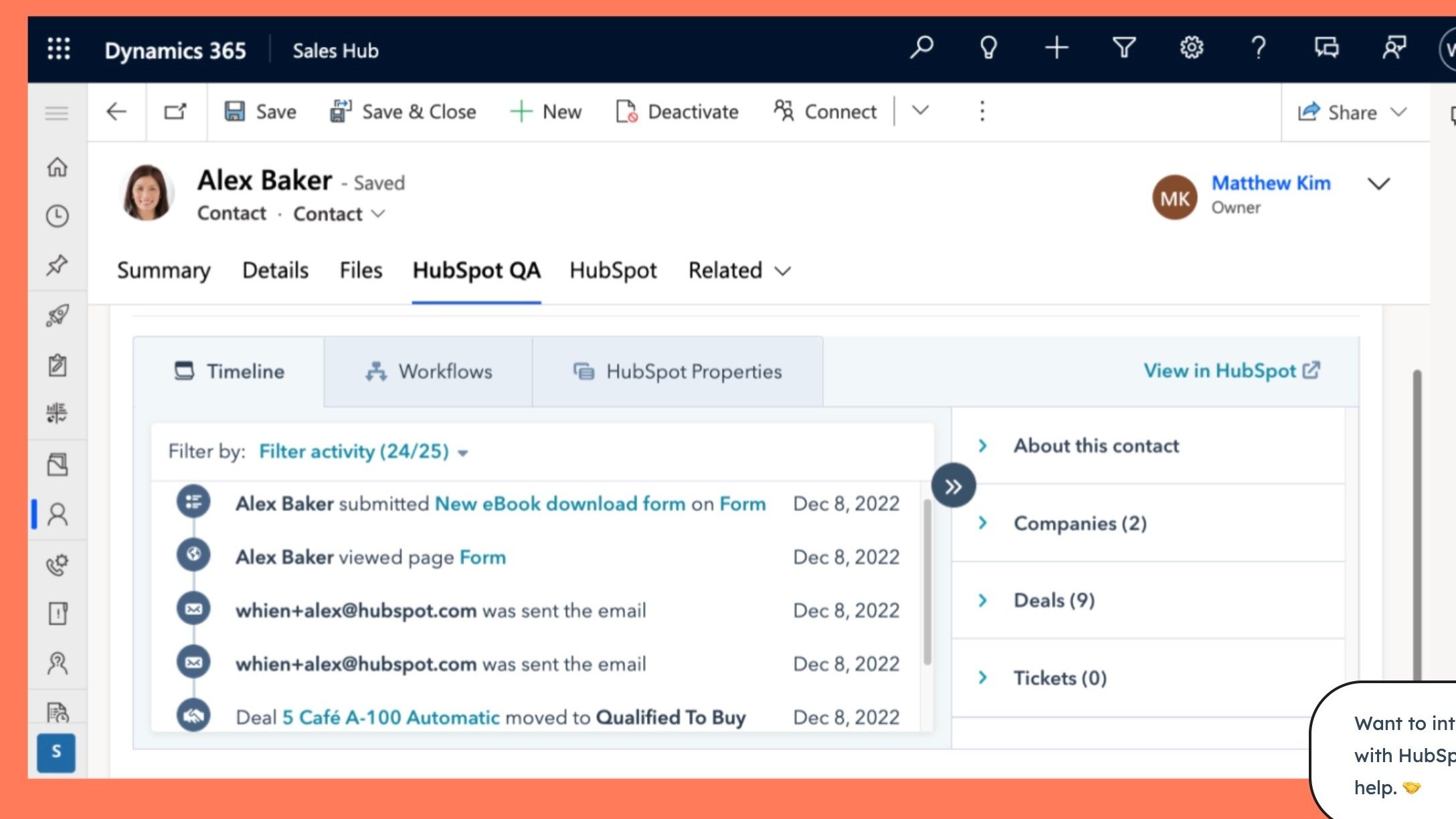Utilize HubSpot tools without leaving Microsoft Dynamics 365. The HubSpot embed feature provides insights into HubSpot contact, company, and deal records and lets you enroll these records in workflows from right within Microsoft Dynamics 365.
