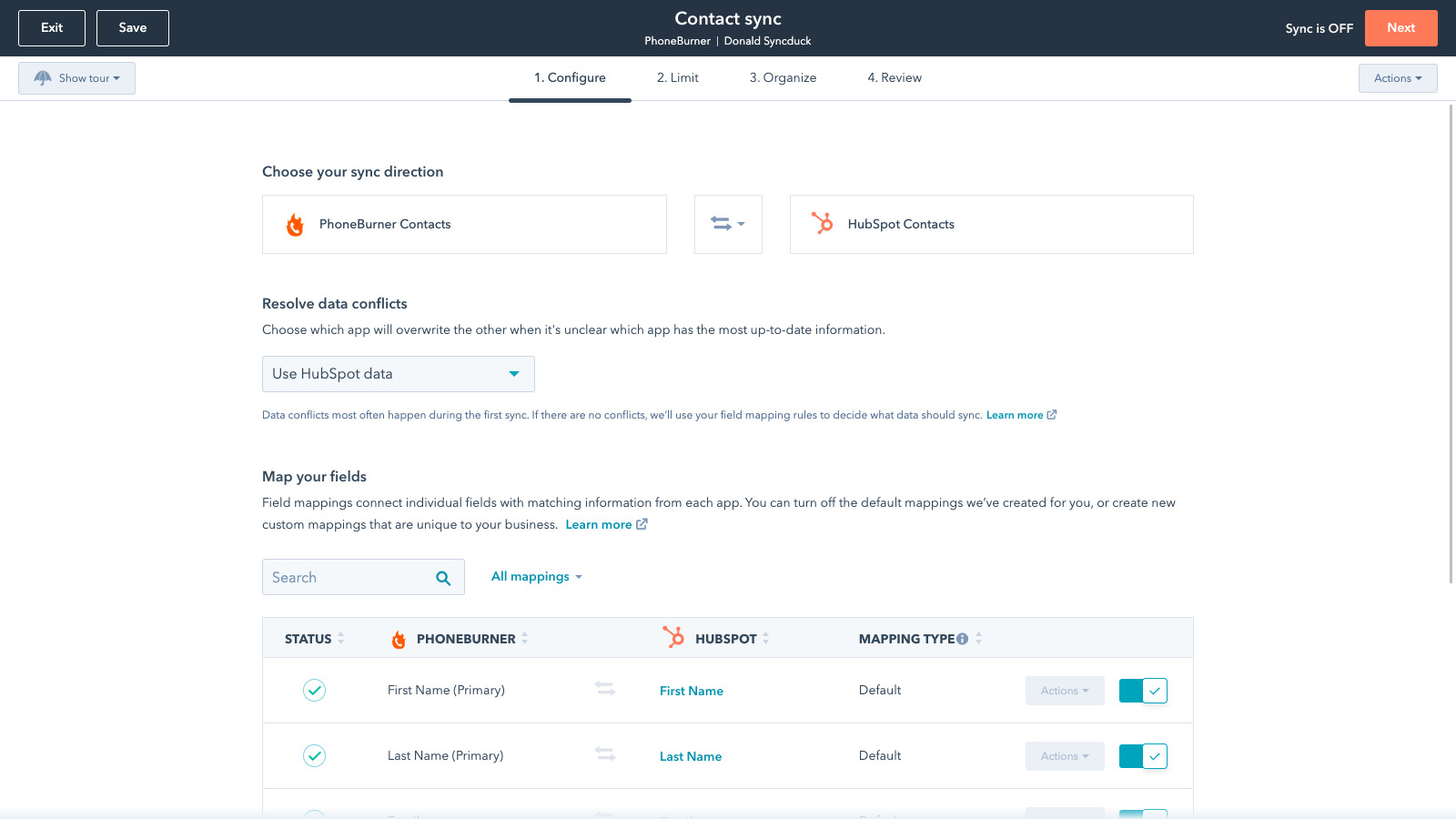 You can set up a one- or two-way sync, which means you can either sync data from PhoneBurner to HubSpot, from HubSpot to PhoneBurner, or back-and-forth! Out-of-the-box default field mappings make set-up quick and keep your data clean and organized. Custom field mappings are available with Data Hub Starter or above.