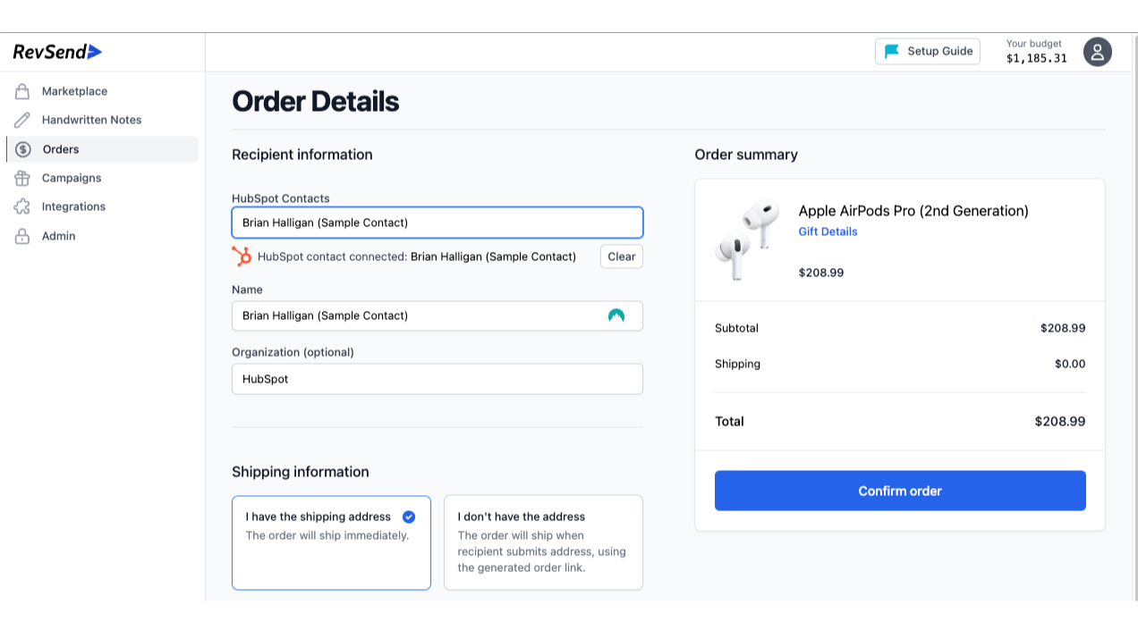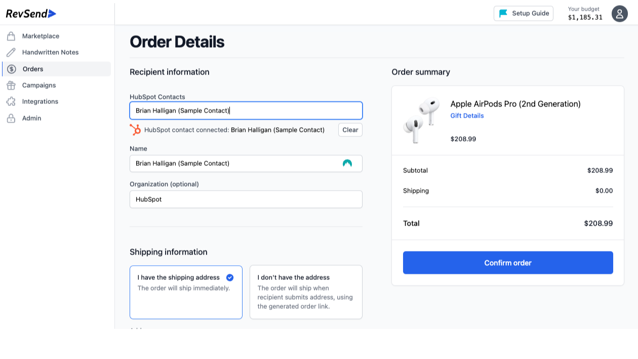Send a gift to a HubSpot contact by searching through HubSpot contacts directly in the RevSend web app. Search by email or name, then connect the contact with a single click. This will automatically create a Task in HubSpot once the gift has been sent.