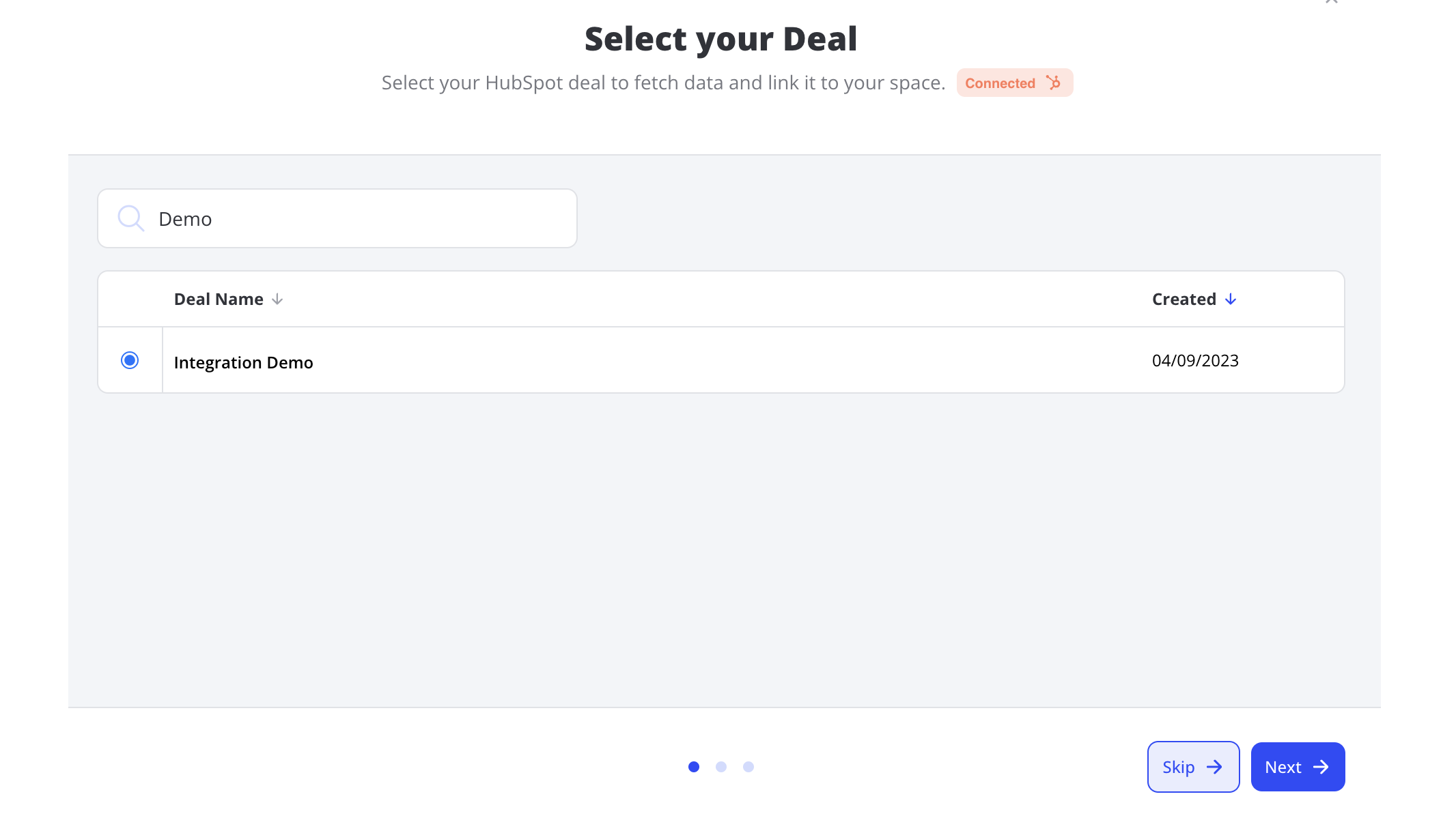 Select the corresponding deal, company, contact, ticket or custom object during portal creation to auto-fill data automatically and associate the space to the HubSpot Object.