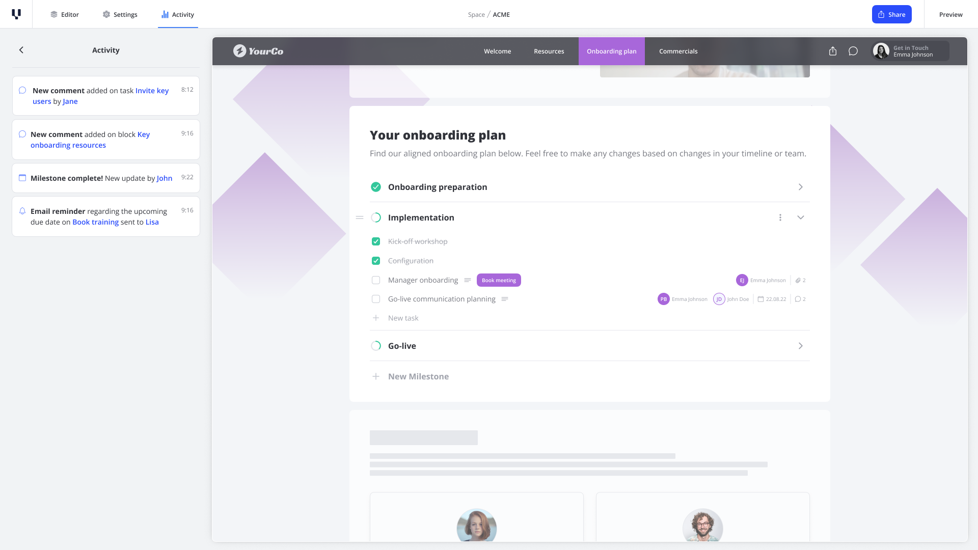 Trigger new onboarding spaces the moment a deal closes, keep tasks and milestones in sync with HubSpot, and give your team a real-time view of who’s on track and who’s stuck.