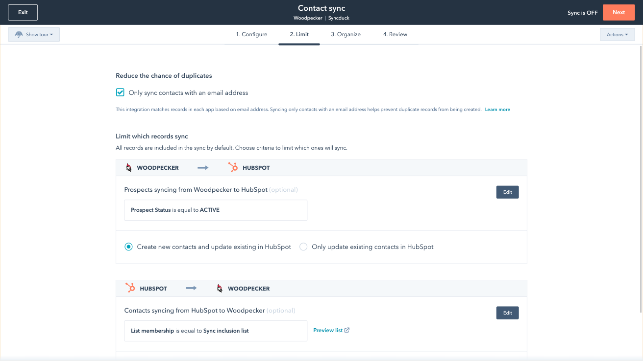 You’re in control of your data. You can set up a one- or two-way sync, which means you can either sync data from only one app to the other or back-and-forth between both apps. You can also add a filter for any Woodpecker field (like interest level or status) or HubSpot list to sync exactly what you want—and nothing you don’t.