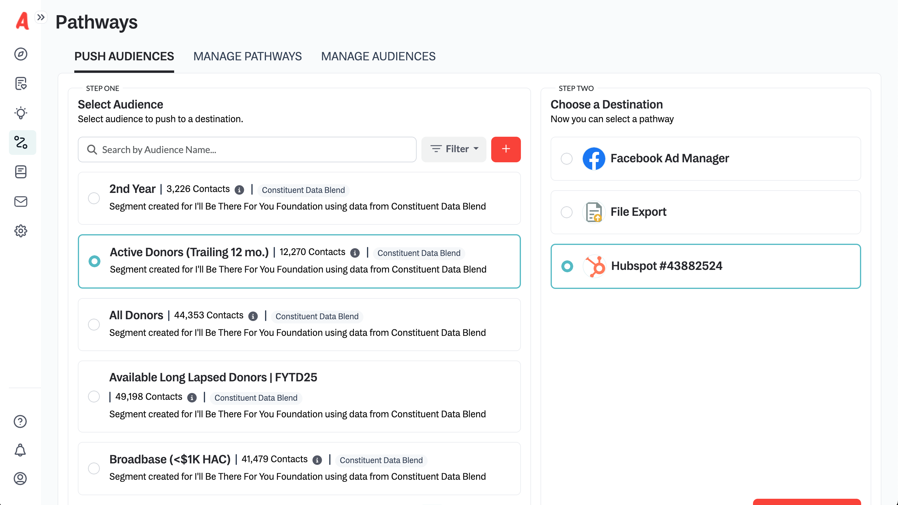 Pathways is a way for Nonprofit organizations to keep their donor data, ad platforms, and email systems in sync. Create custom segments or use the automated insights to identify new donor cohorts to push into your HubSpot instance.