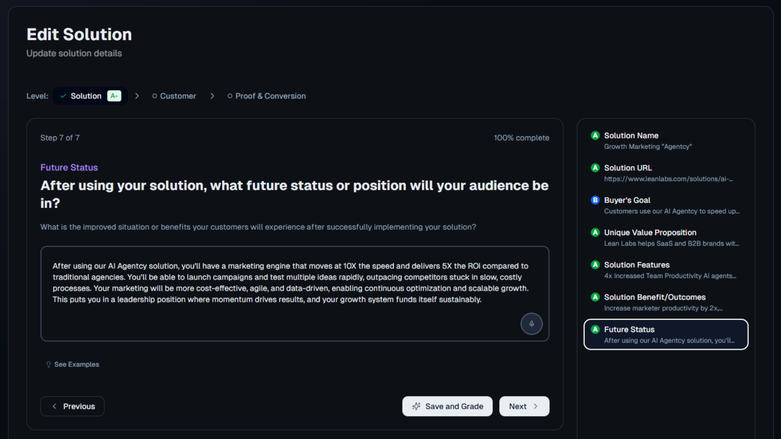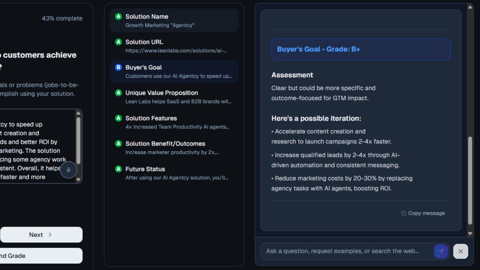 AI analyzes form responses for specificity, clarity, and completeness. Returns color-coded grades (green/yellow/red) with improvement suggestions in real-time. Grades and suggestions stored with responses, displayed inline.