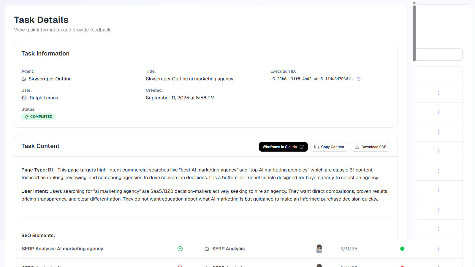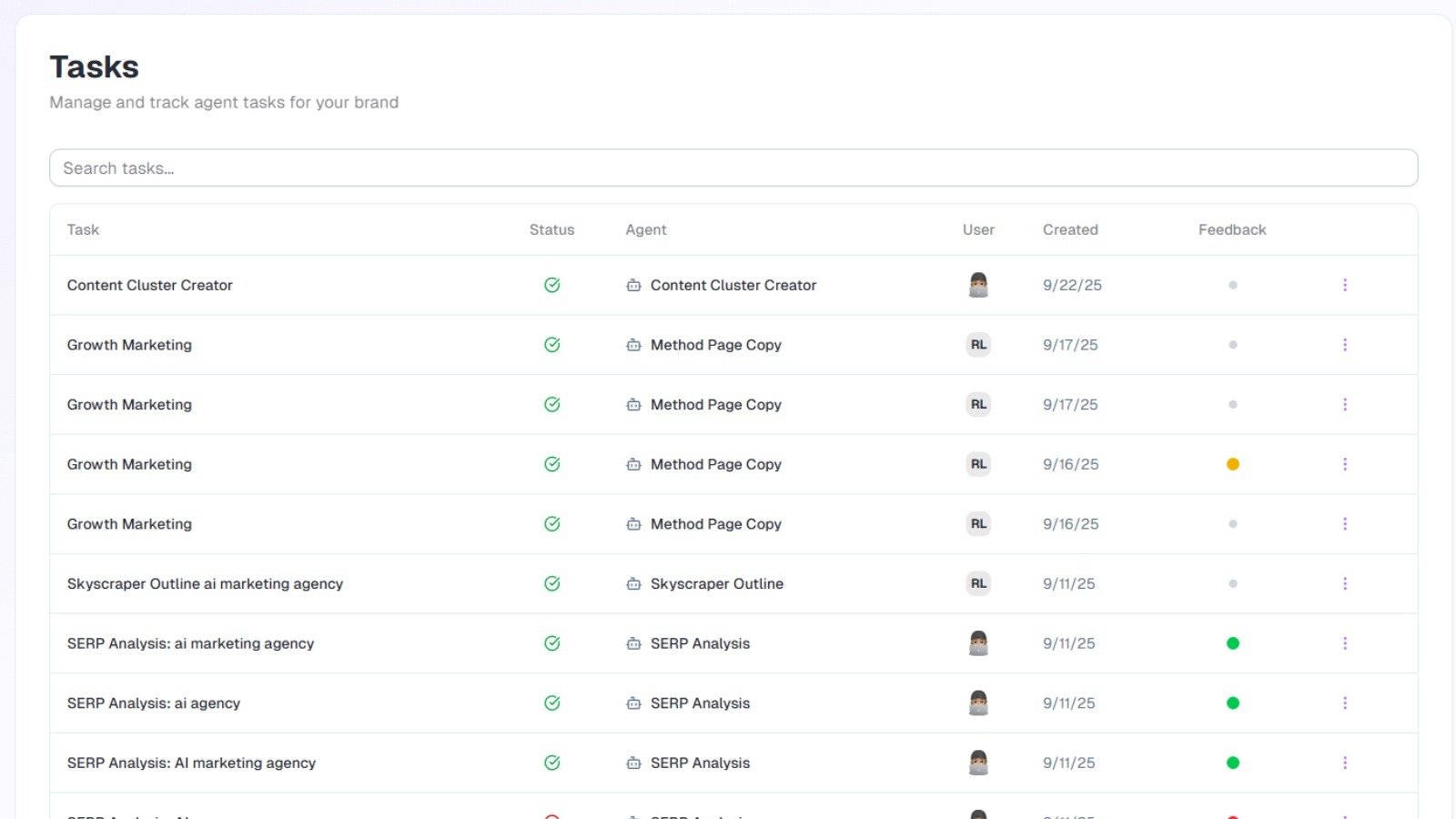 Tracks content generation through five states: pending, in progress, completed, cancelled, or error. Users receive in-app and email notifications when tasks finish or fail. Filter by status, search by title, view by team member. Each task shows requester, timing, processing agent, and full output with team feedback.