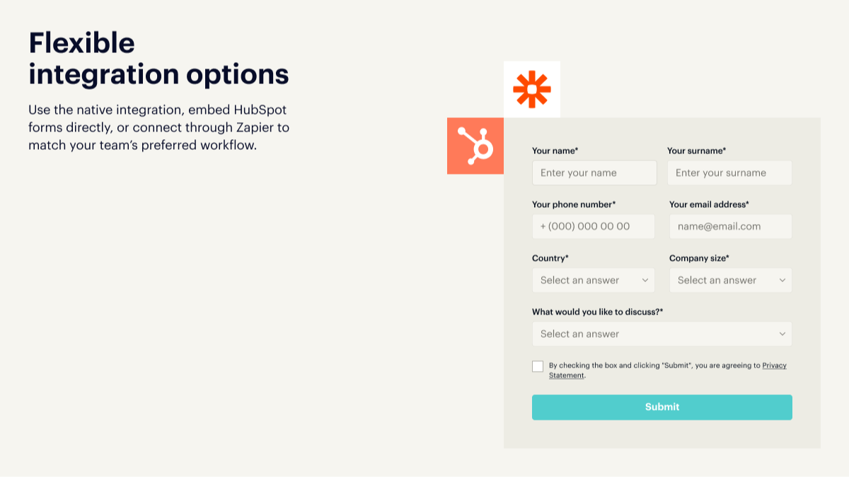Use the native integration, embed HubSpot forms directly, or connect through Zapier to match your team’s preferred workflow.