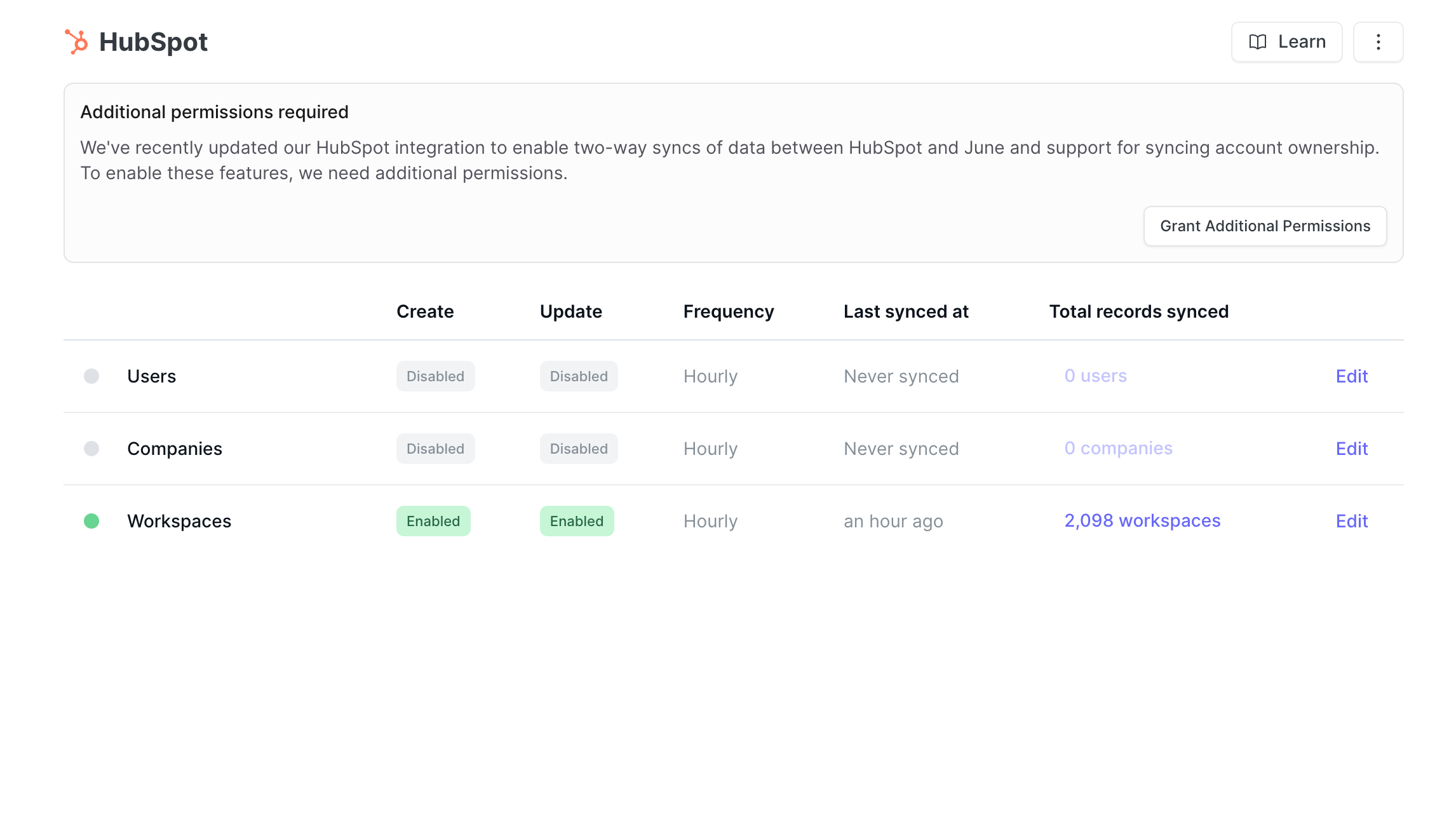 Sync data from HubSpot back to June to keep your insights up to date. Ensure your analytics reflect the latest customer interactions.
