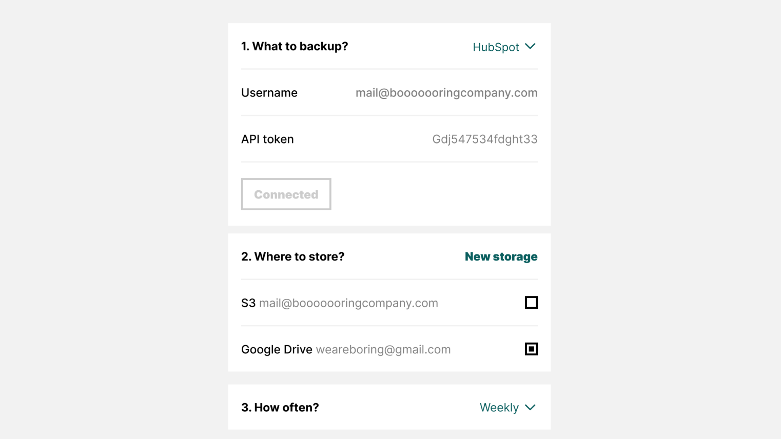 It automatically backs up your HubSpot information to your storage every day or every week. This means you'll always have the most up-to-date version of your CRM data on hand without manually saving it.