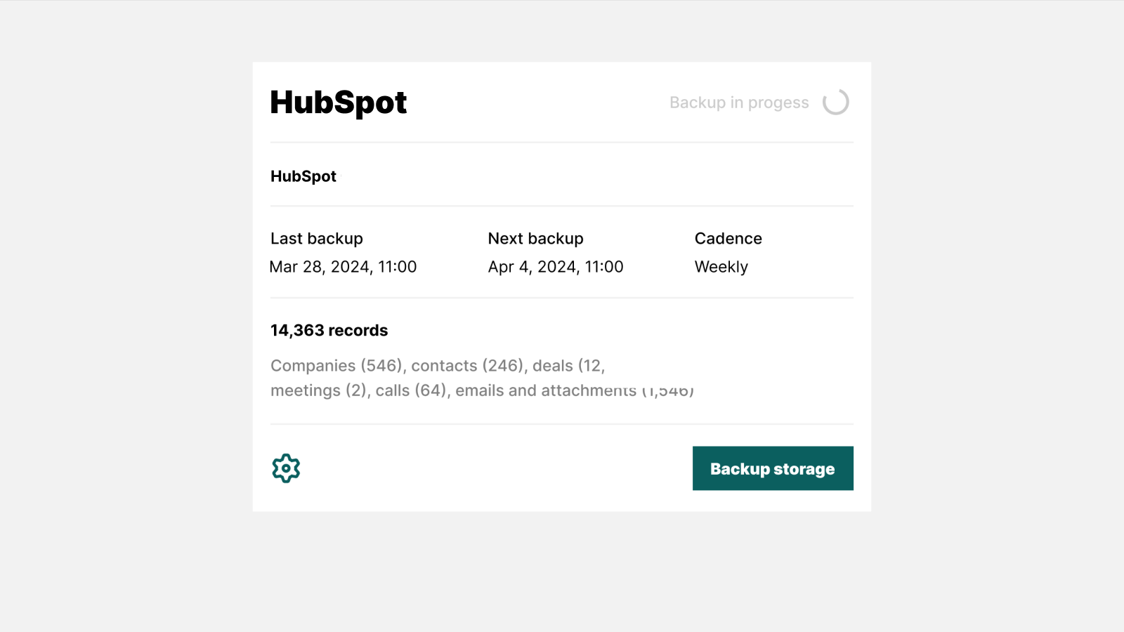 We back up the following information: Owners, Pipelines and their stages, Deals, Contacts, Companies, Calls, Emails, Meetings, Tasks, Notes, Products, Quotes, Attachments