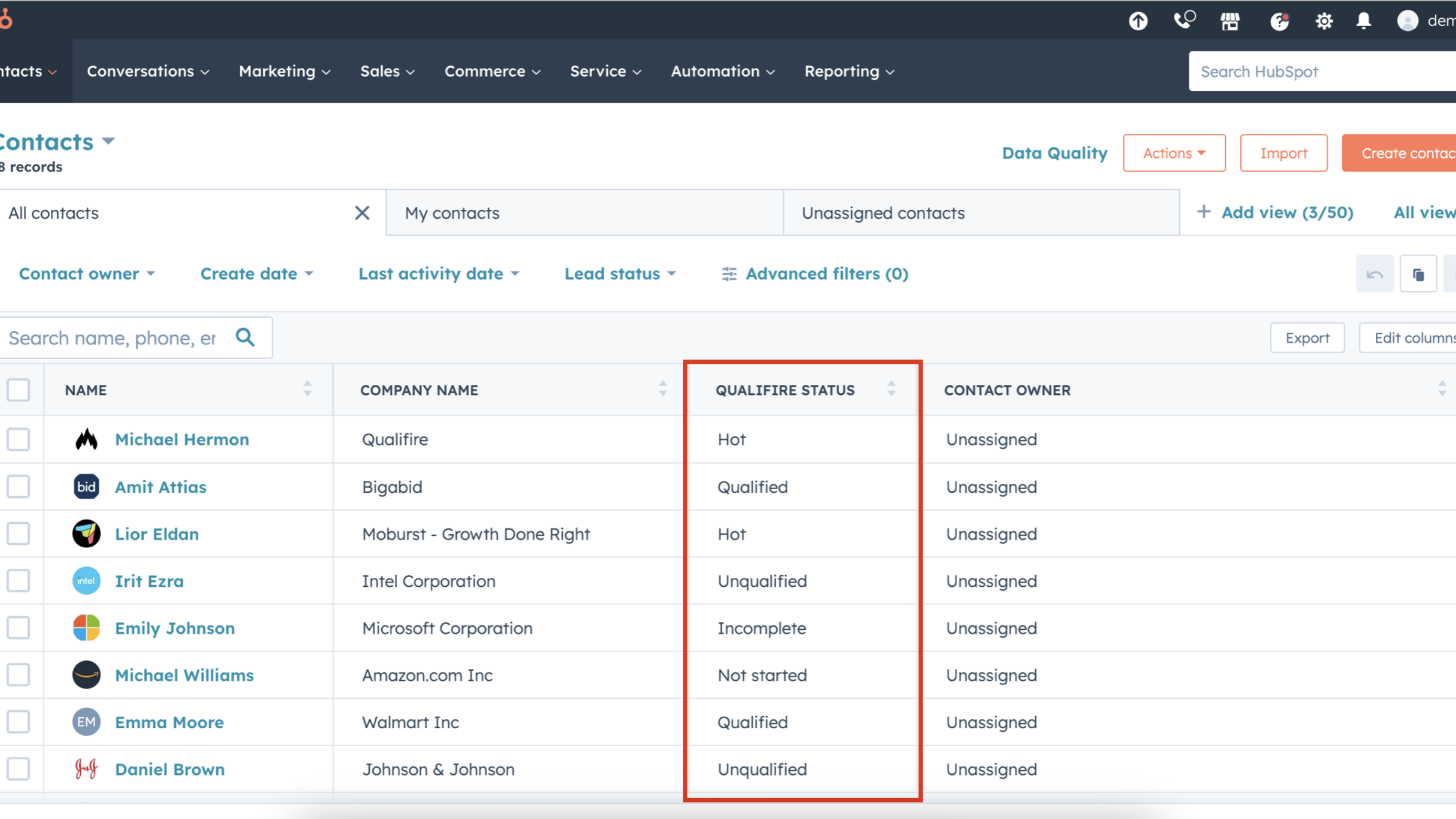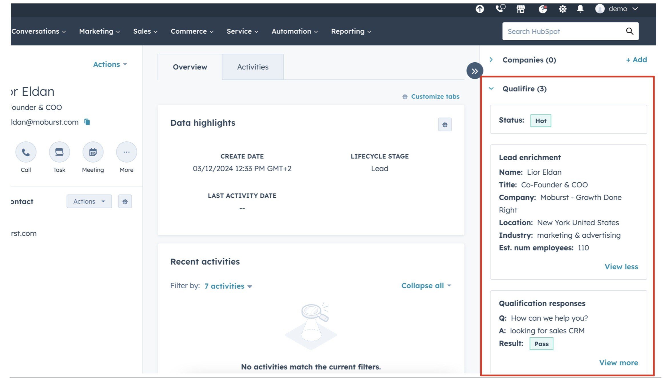 Lead qualification - based on AI and data enrichment, each lead is classified as unqualified, qualified, or HOT.