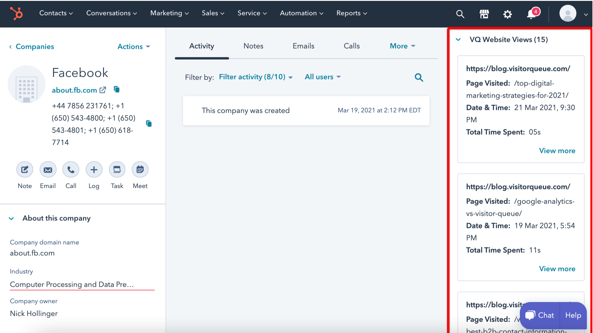 All of the website visitor information you need in one place. After syncing company, deal and contact records from Visitor Queue to HubSpot, you'll automatically see visit details appear on the right side of those records in HubSpot!